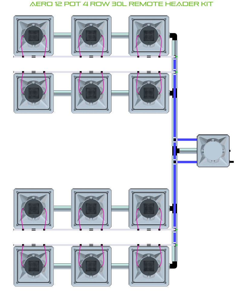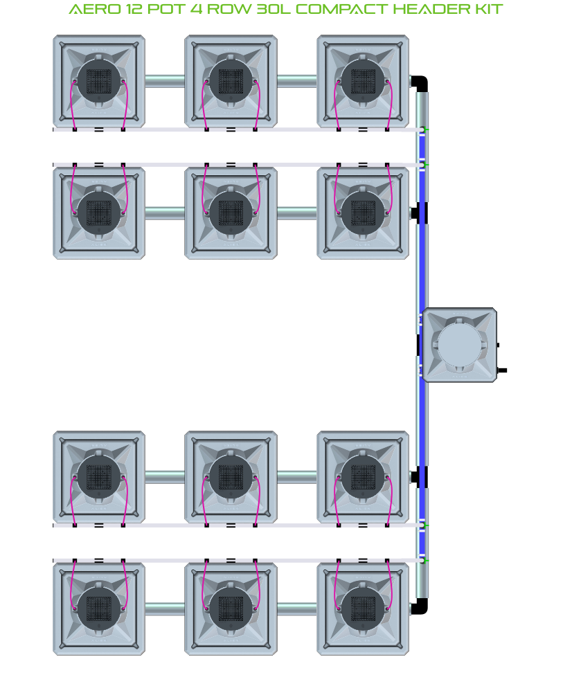 The ALIEN AERO 12 Pot 4 Row Kit is available in 2 pot sizes and 2 header configurations. Easy to configure and assemble with advanced features and setup options including the ability to create an aisle in the middle of rows for complete plant access, grow 12 plants to perfection aeroponically with this ALIEN AERO Kit!