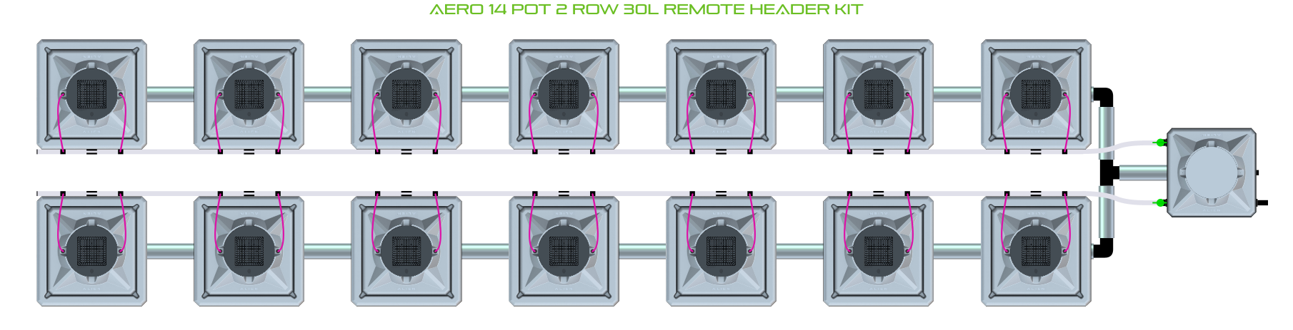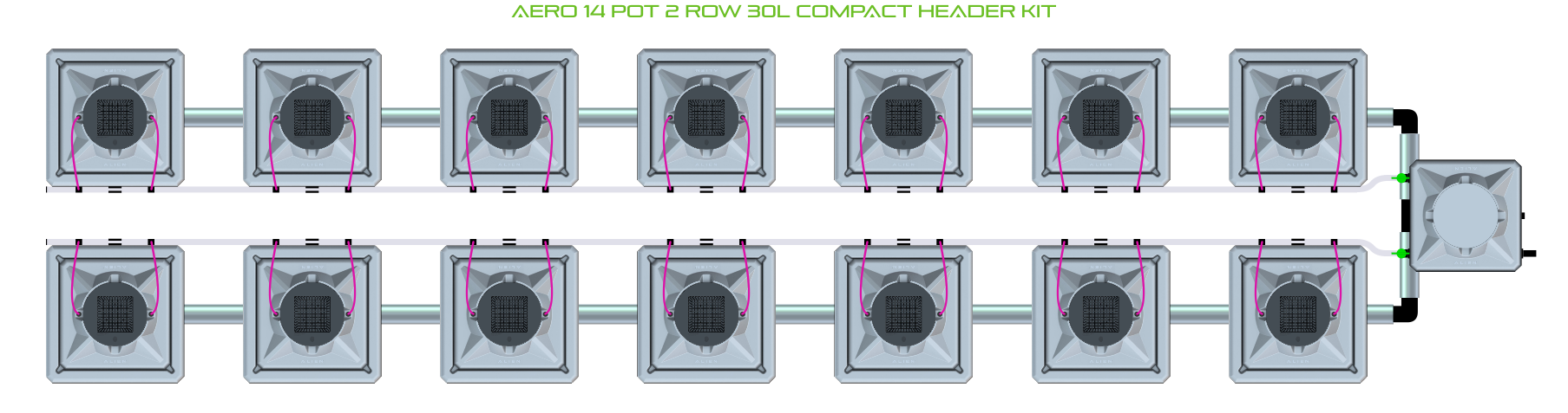 The ALIEN AERO 14 Pot 2 Row Kit is available in 2 pot sizes and 2 header configurations. Easy to configure and assemble with advanced features and setup options, grow 14 plants to perfection aeroponically with this ALIEN AERO Kit!