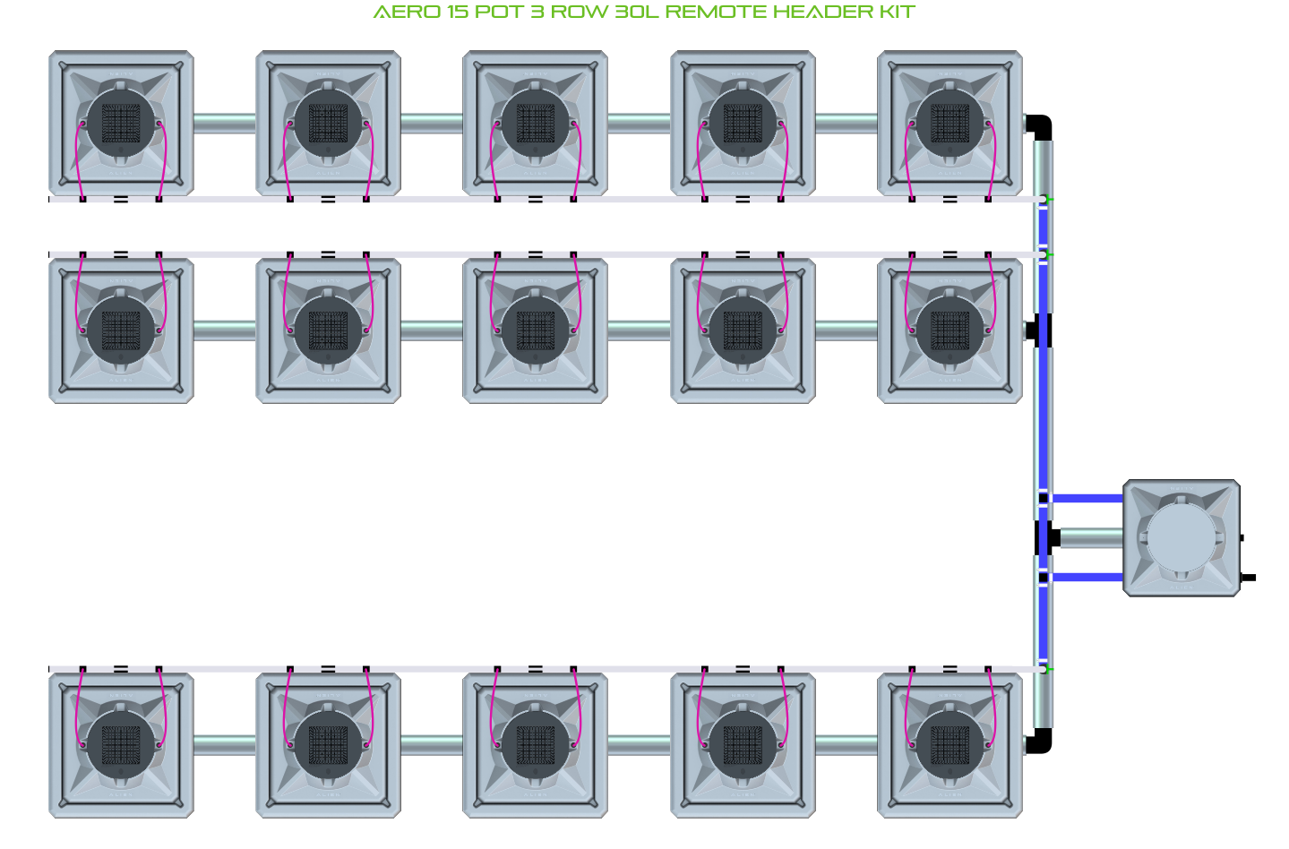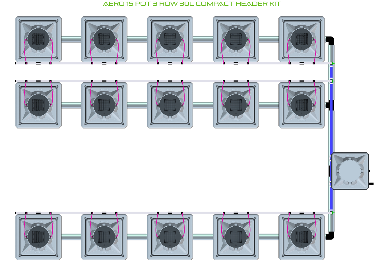 The ALIEN AERO 15 Pot 3 Row Kit is available in 2 pot sizes and 2 header configurations. Easy to configure and assemble with advanced features and setup options including the ability to create an aisle in the middle of rows for complete plant access, grow 15 plants to perfection aeroponically with this ALIEN AERO Kit!