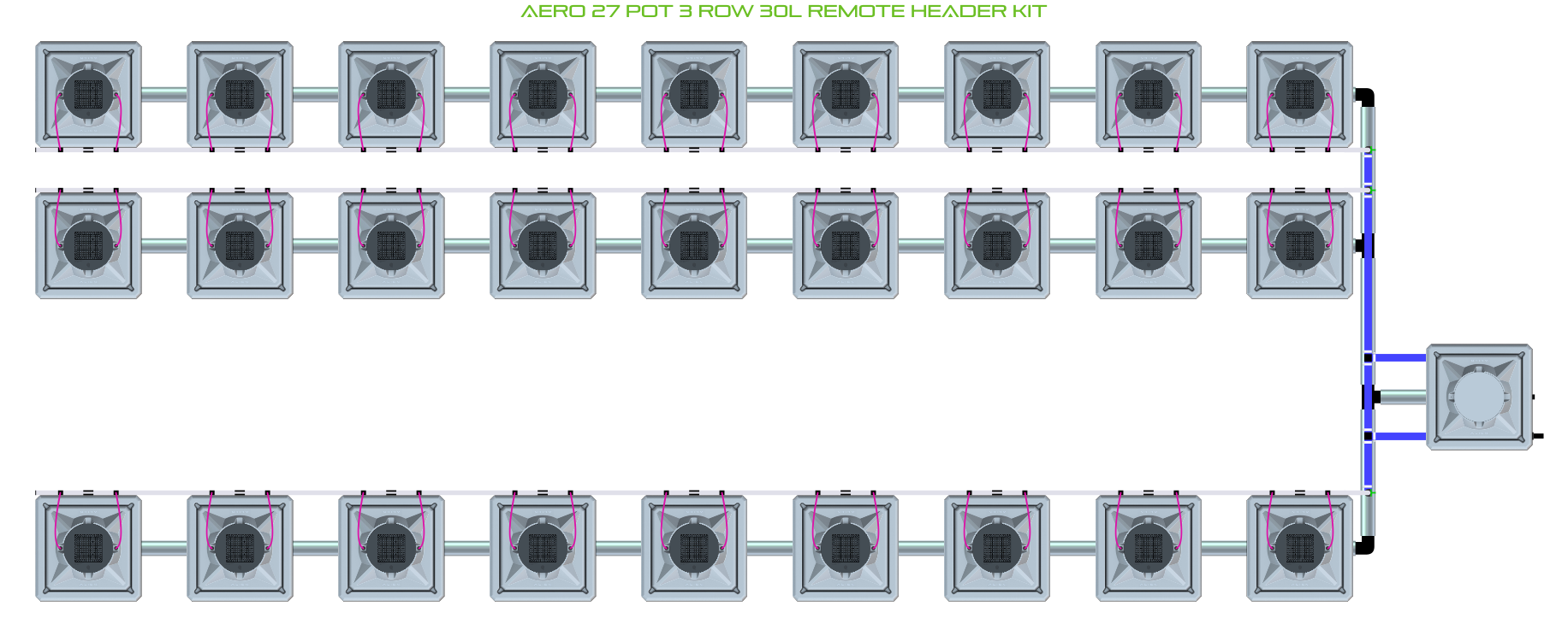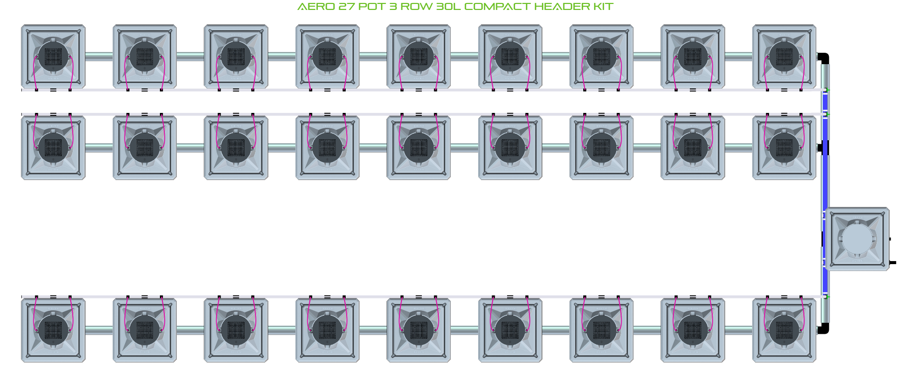 The ALIEN AERO 27 Pot 3 Row Kit is available in 2 pot sizes and 2 header configurations. Easy to configure and assemble with advanced features and setup options including the ability to create an aisle in the middle of rows for complete plant access, grow 27 plants to perfection aeroponically with this ALIEN AERO Kit!