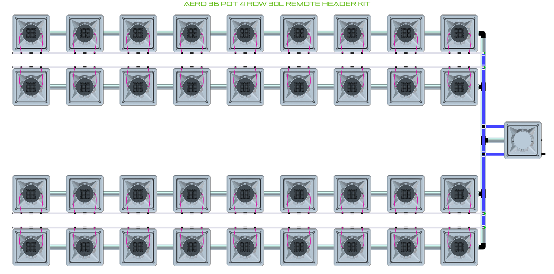 The ALIEN AERO 36 Pot 4 Row Kit is available in 2 pot sizes and 2 header configurations. Easy to configure and assemble with advanced features and setup options including the ability to create an aisle in the middle of rows for complete plant access, grow 36 plants to perfection aeroponically with this ALIEN AERO Kit!
