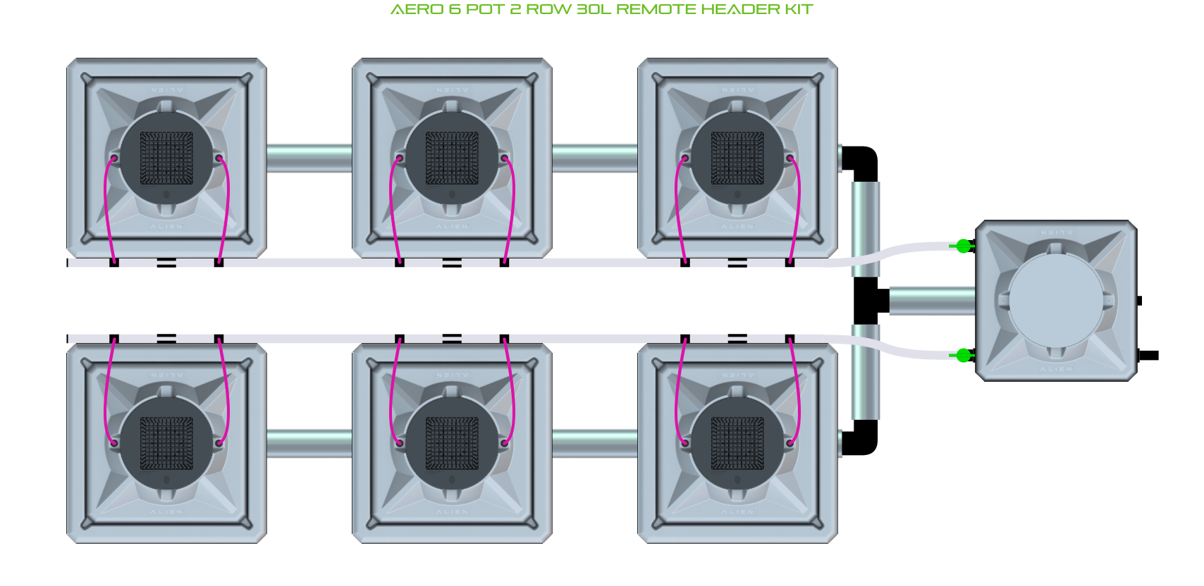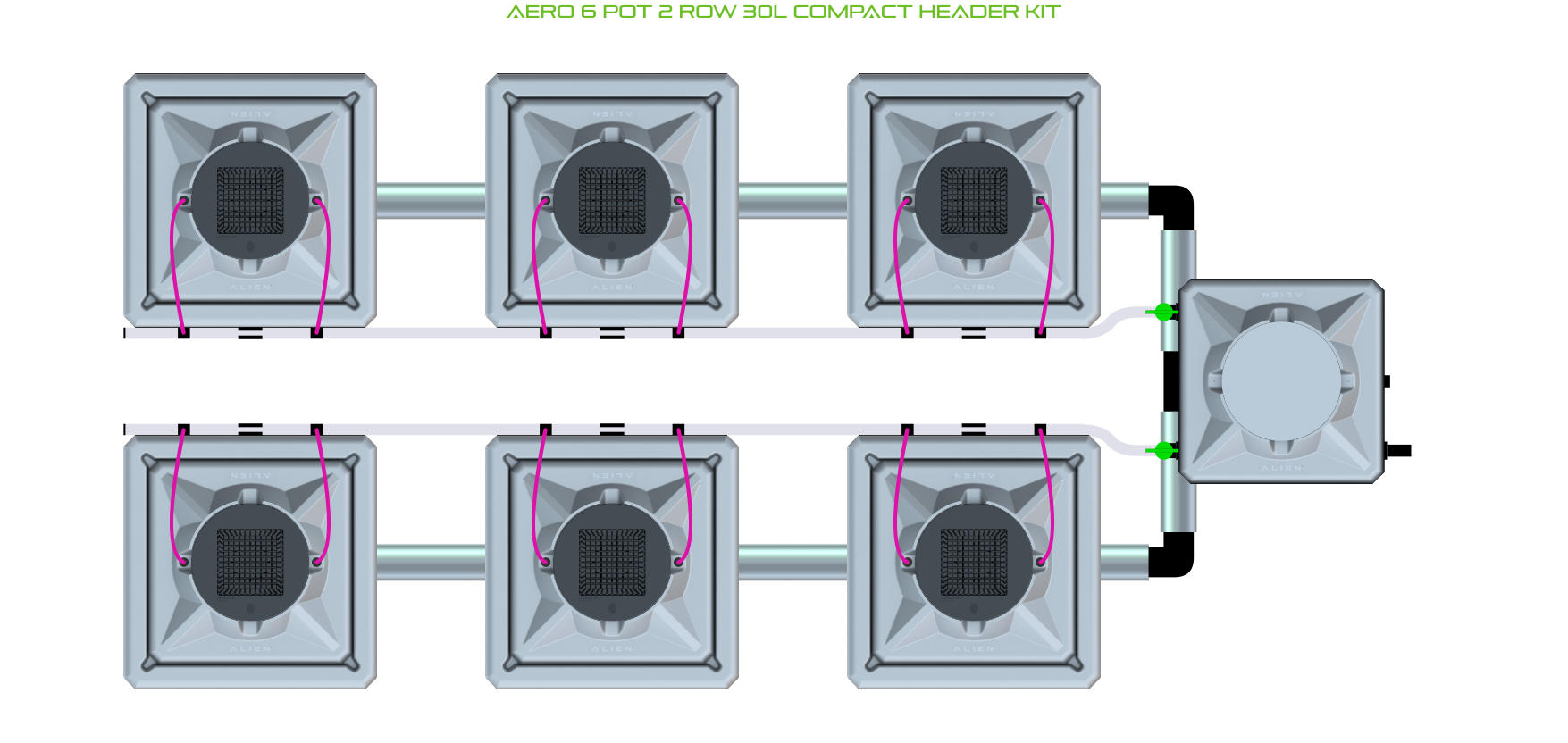 The ALIEN AERO 6 Pot 2 Row Kit is available in 2 pot sizes and 2 header configurations. Easy to configure and assemble with advanced features and setup options, grow 6 plants to perfection aeroponically with this ALIEN AERO Kit!