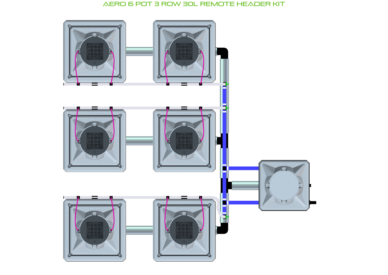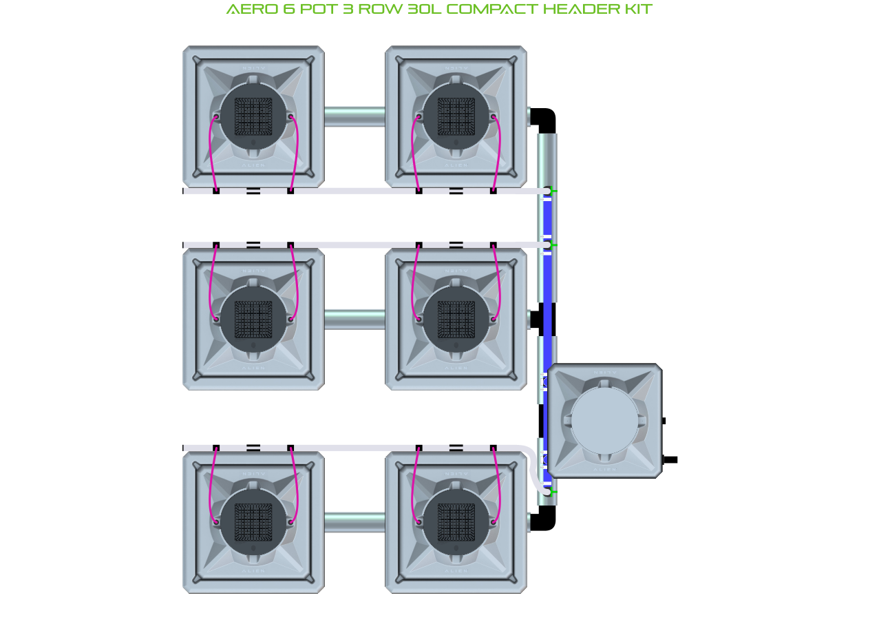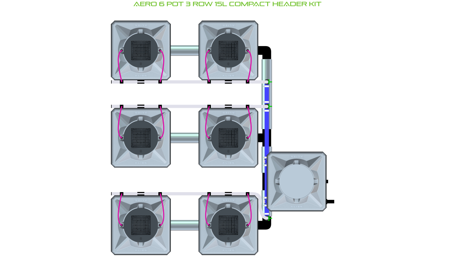 The ALIEN AERO 6 Pot 3 Row Kit is available in 2 pot sizes and 2 header configurations. Easy to configure and assemble with advanced features and setup options, grow 6 plants to perfection aeroponically with this ALIEN AERO Kit!