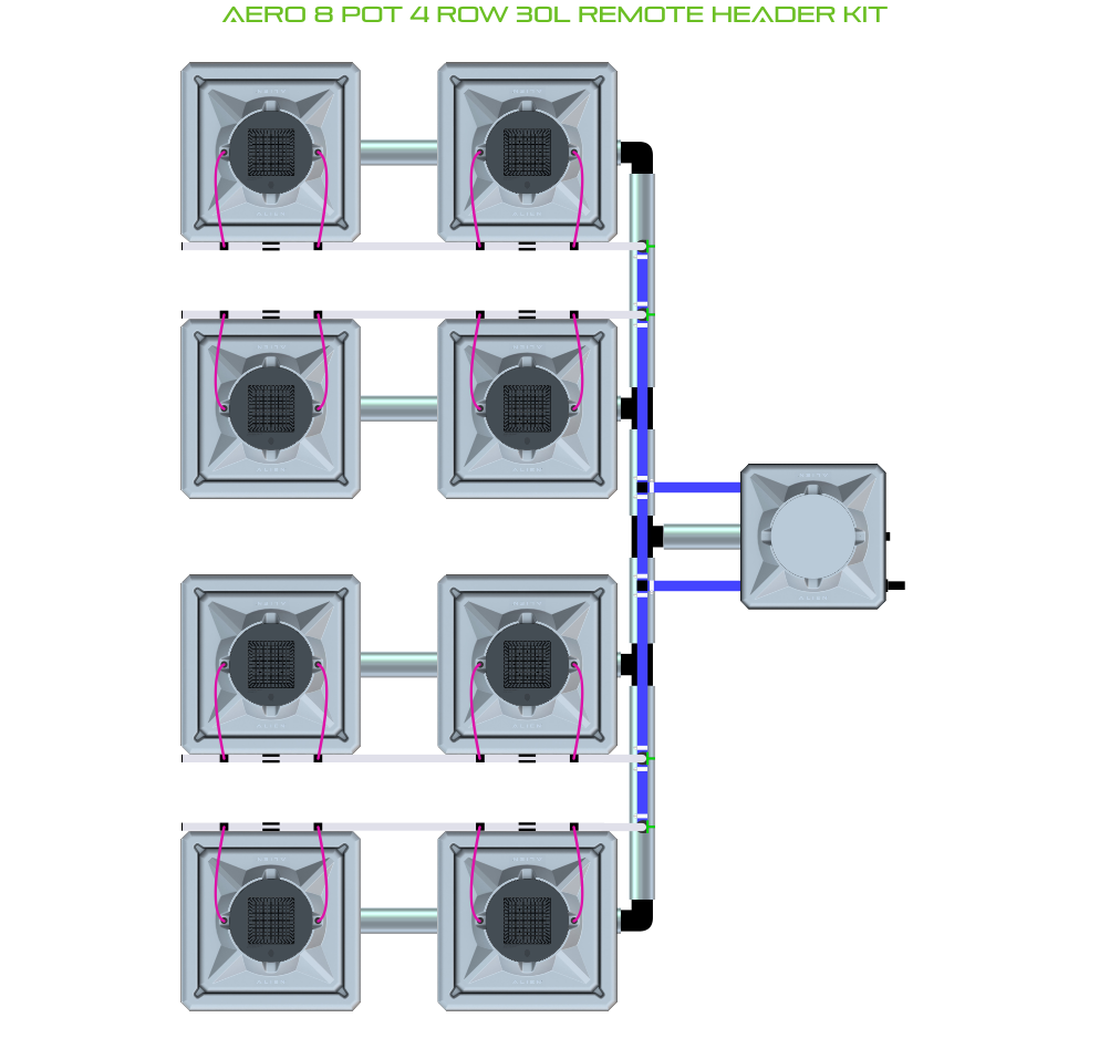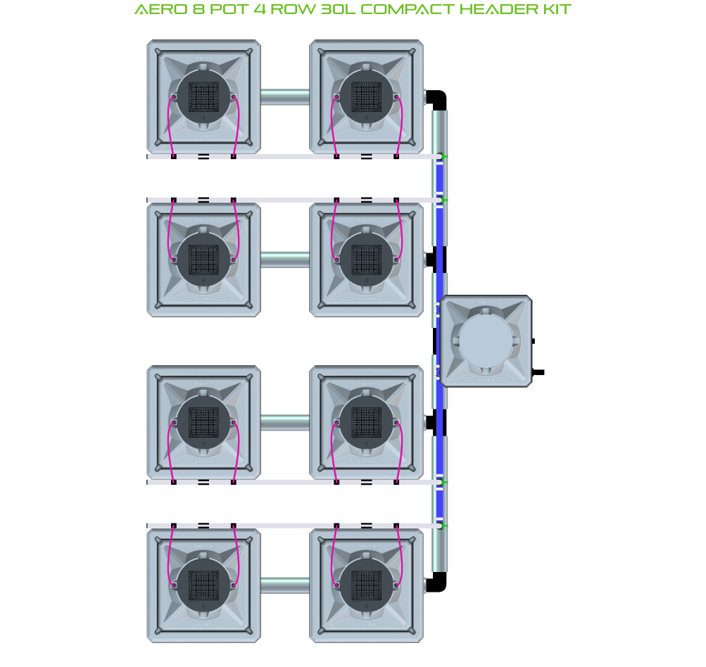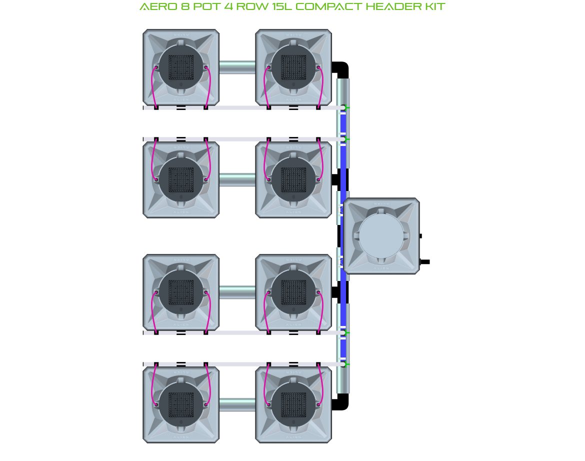 The ALIEN AERO 8 Pot 4 Row Kit is available in 2 pot sizes and 2 header configurations. Easy to configure and assemble with advanced features and setup options, grow 8 plants to perfection aeroponically with this ALIEN AERO Kit!