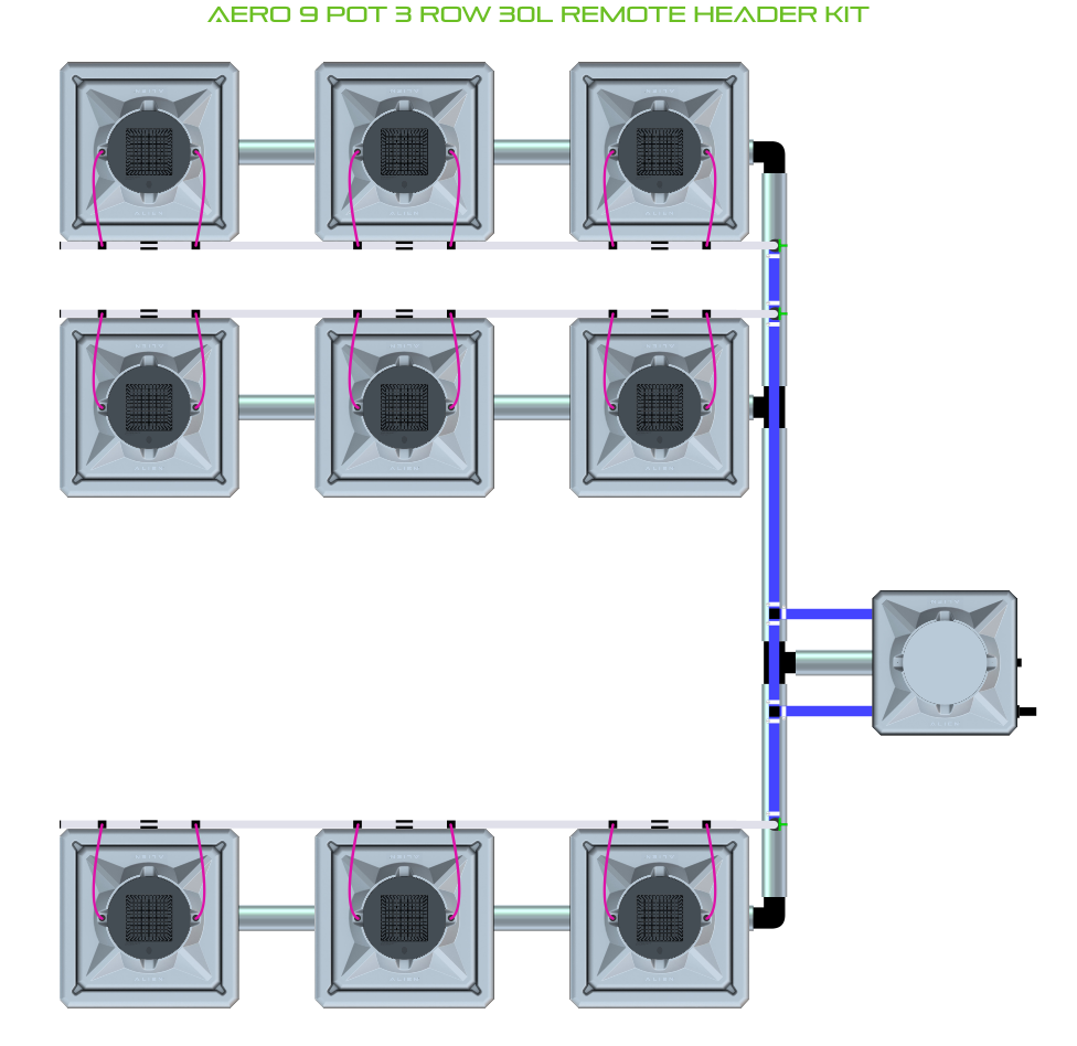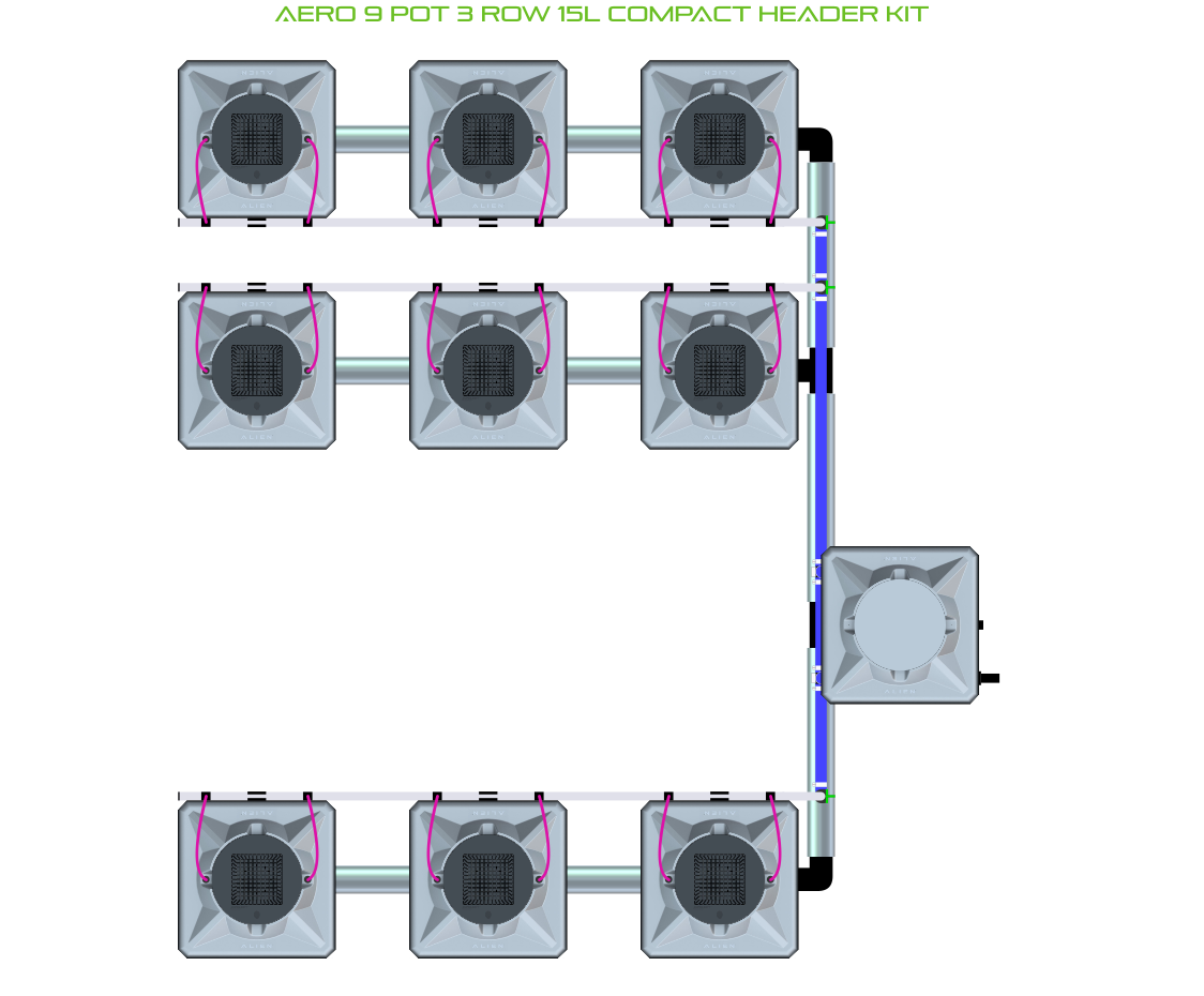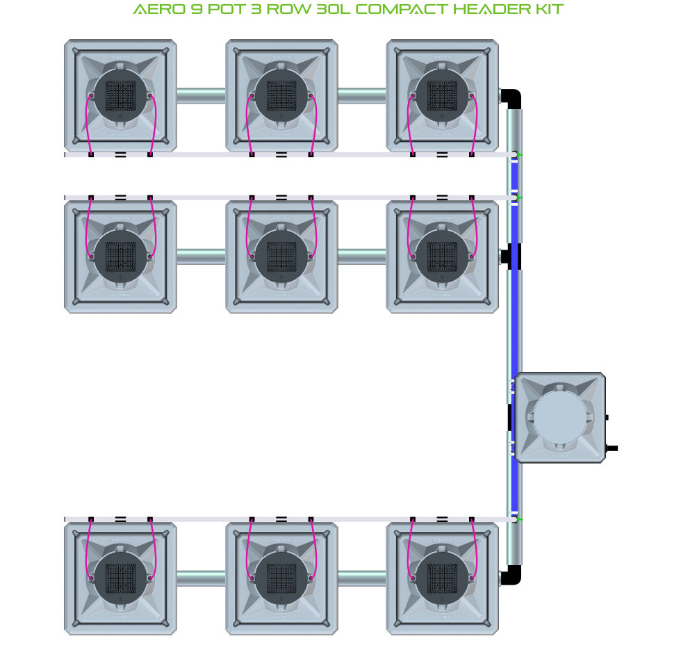 The ALIEN AERO 9 Pot 3 Row Kit is available in 2 pot sizes and 2 header configurations. Easy to configure and assemble with advanced features and setup options including the ability to create an aisle in the middle of rows for complete plant access, grow 9 plants to perfection aeroponically with this ALIEN AERO Kit!