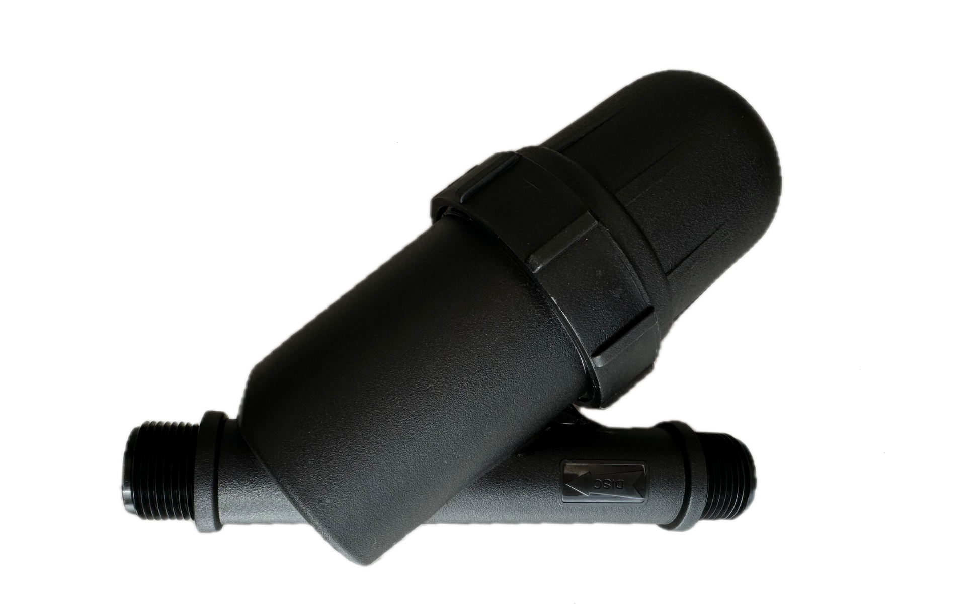 A fine mesh filter with 3/4" male pipe thread fittings for the EasyFeed system.