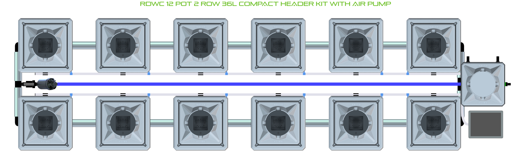 The ALIEN RDWC 12 Pot 2 Row Kit is available in 2 pot sizes and 2 header configurations, with or without an air pump (required for operation). Easy to configure and assemble with advanced features and setup options, grow 12 plants to perfection in recirculating deep water culture with this ALIEN RDWC Kit!