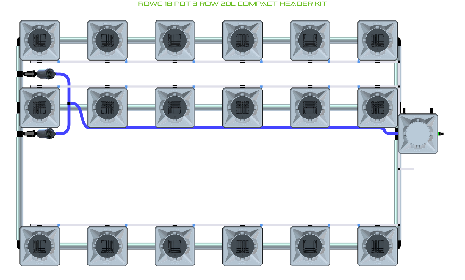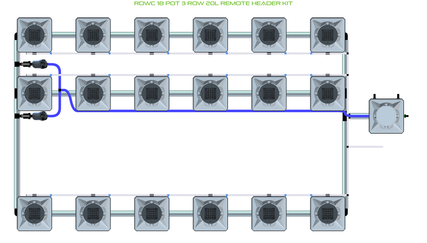 The ALIEN RDWC 18 Pot 3 Row Kit is available in 2 pot sizes and 2 header configurations, with or without an air pump (required for operation). Easy to configure and assemble with advanced features and setup options including the ability to create an aisle in the middle of rows for complete plant access, grow 18 plants to perfection in recirculating deep water culture with this ALIEN RDWC Kit!