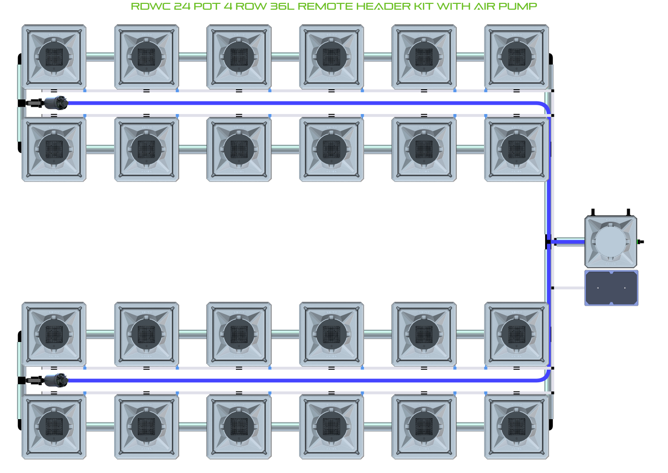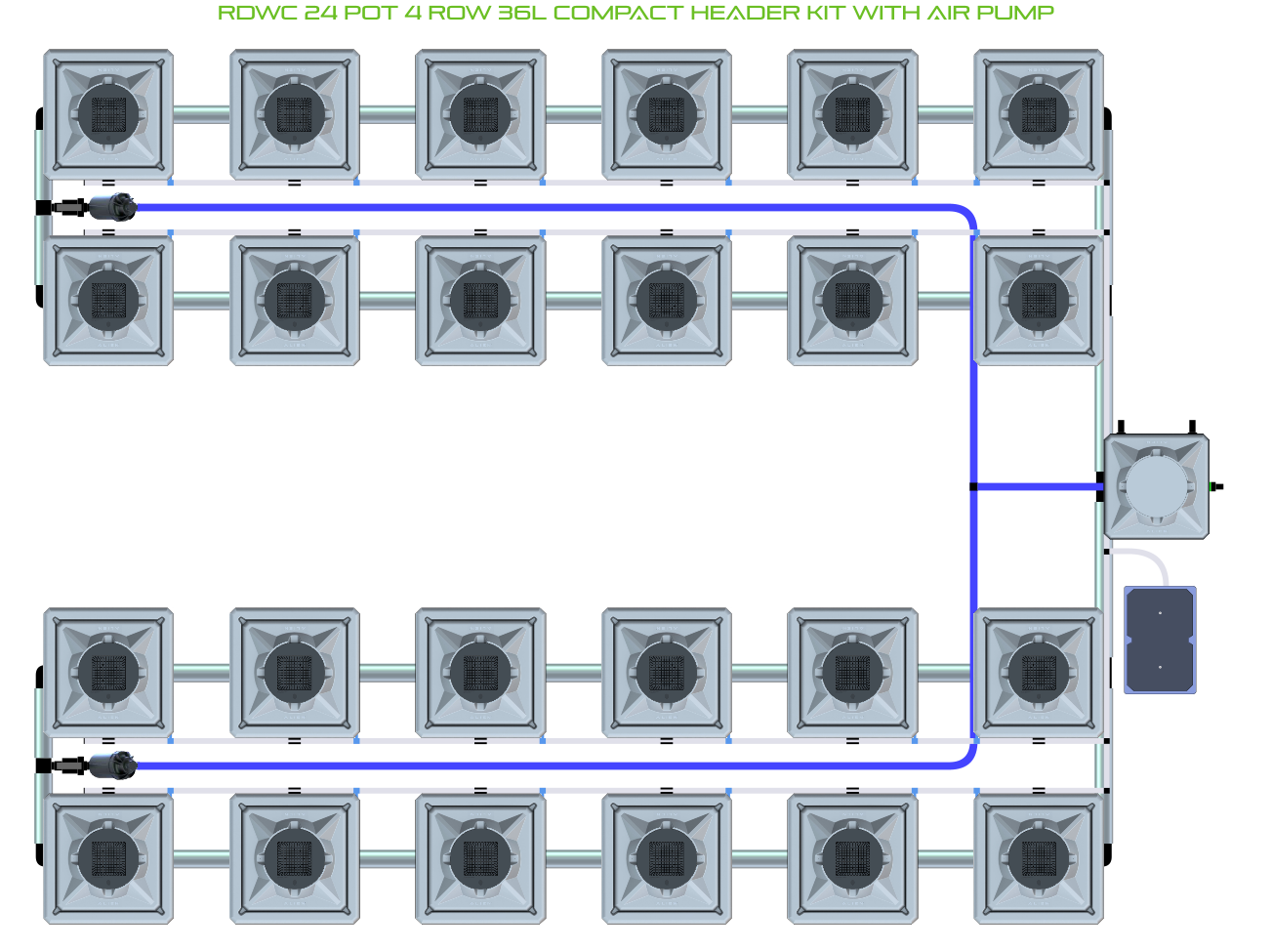 The ALIEN RDWC 24 Pot 4 Row Kit is available in 2 pot sizes and 2 header configurations, with or without an air pump (required for operation). Easy to configure and assemble with advanced features and setup options including the ability to create an aisle in the middle of rows for complete plant access, grow 24 plants to perfection in recirculating deep water culture with this ALIEN RDWC Kit!