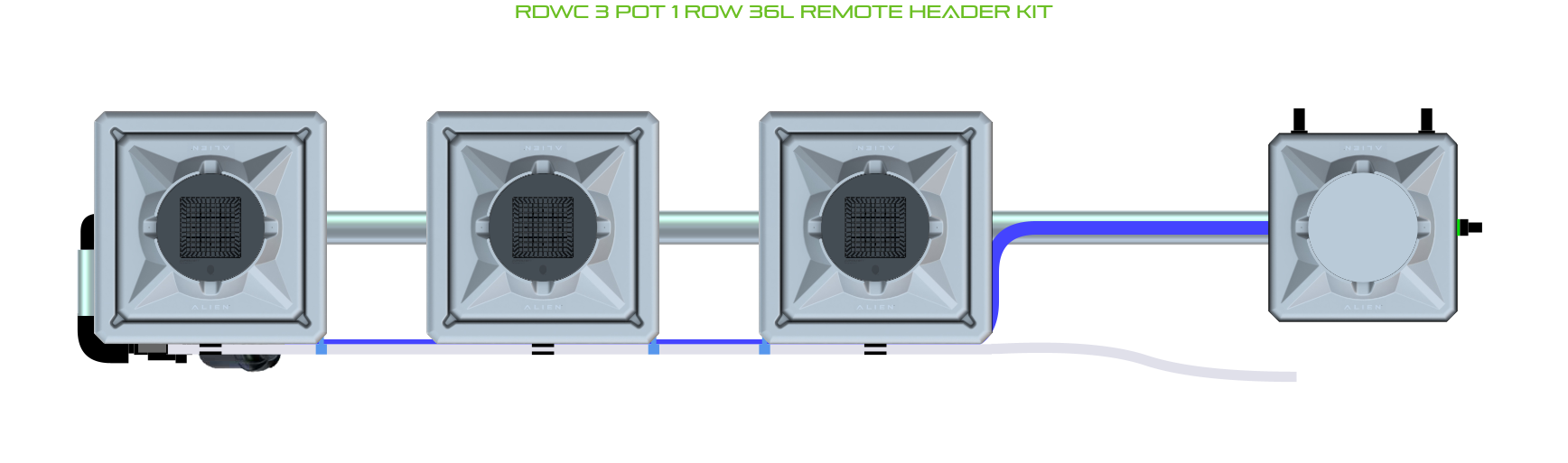 The ALIEN RDWC 3 Pot 1 Row Kit is available in 2 pot sizes and 2 header configurations, with or without an air pump (required for operation). Easy to configure and assemble with advanced features and setup options, grow 3 plants to perfection in recirculating deep water culture with this ALIEN RDWC Kit!