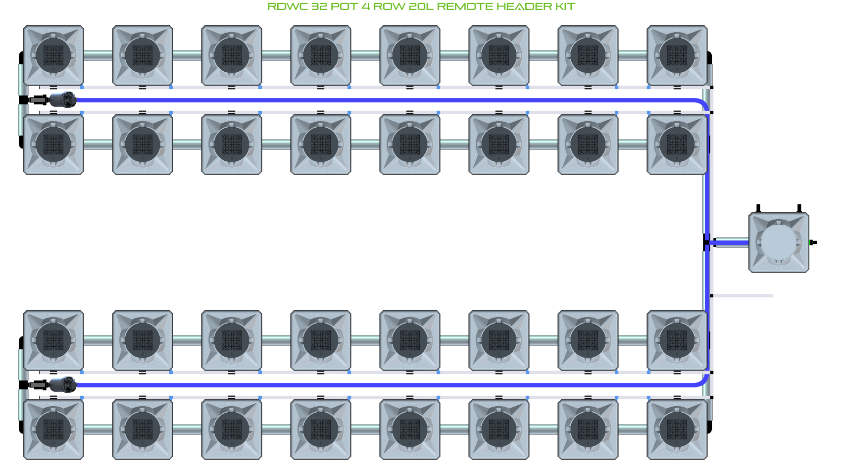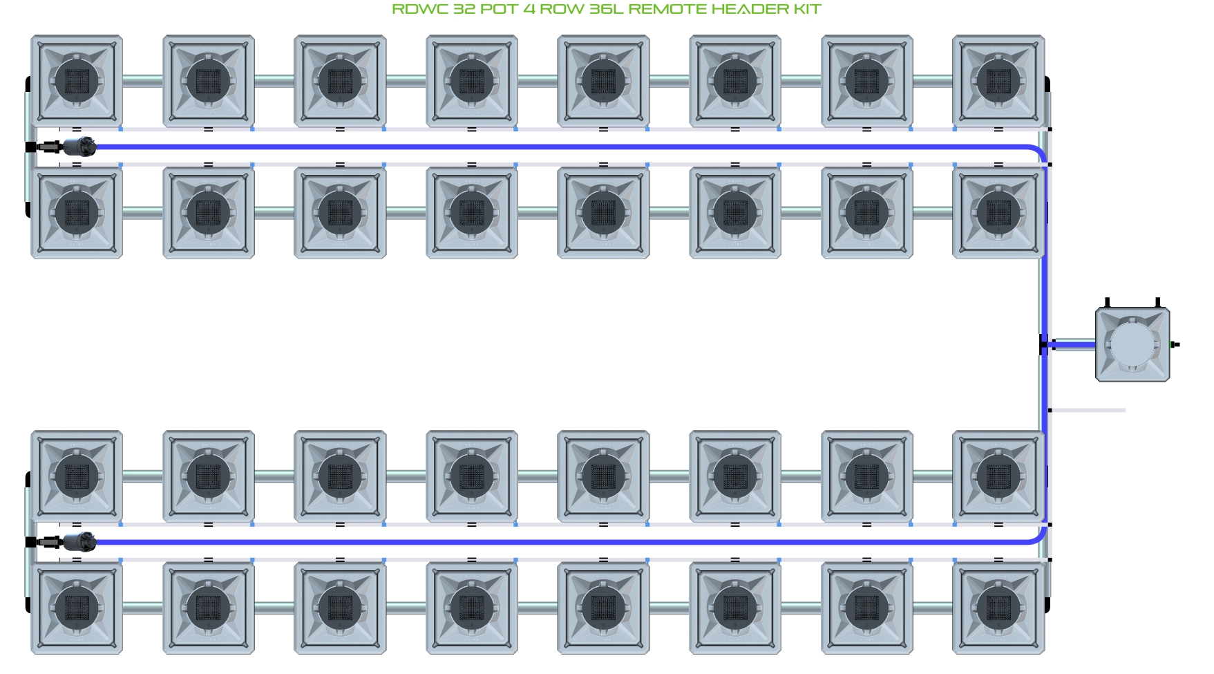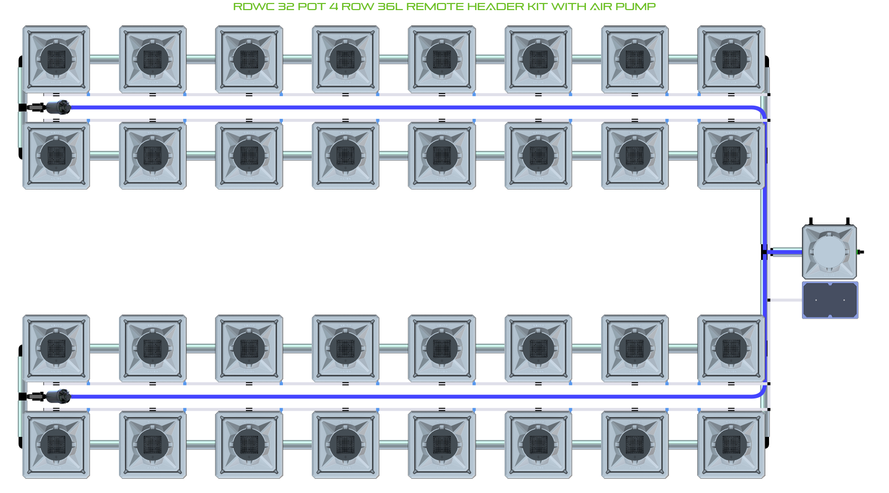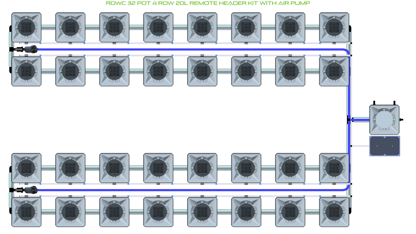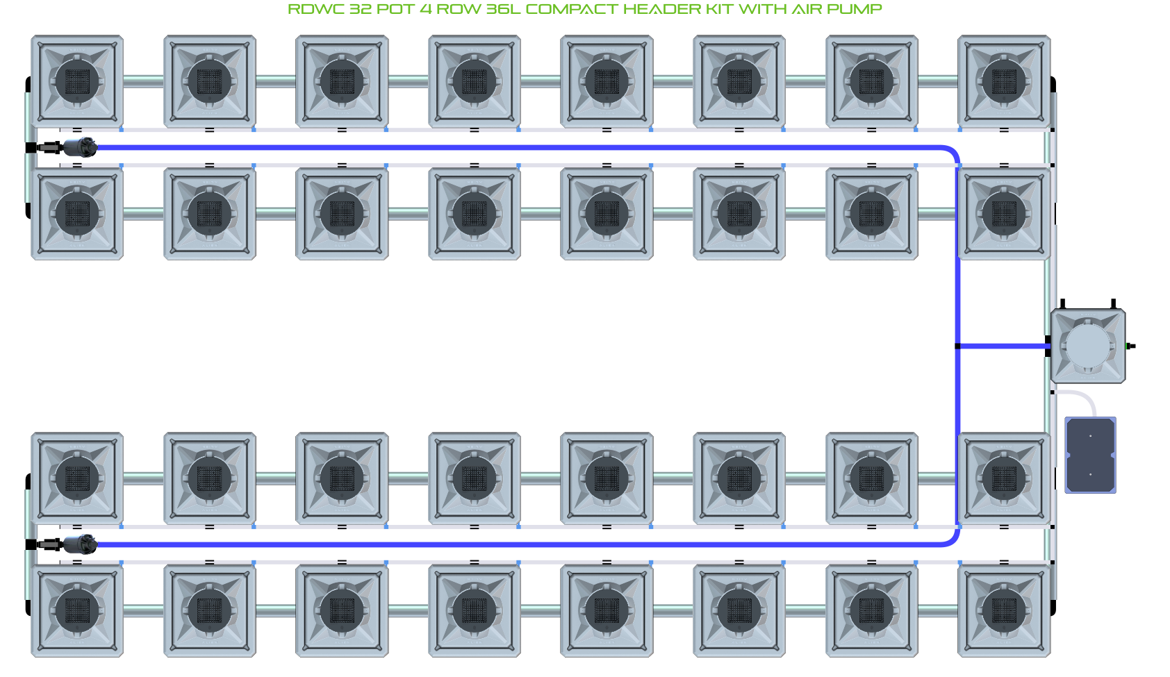 The ALIEN RDWC 32 Pot 4 Row Kit is available in 2 pot sizes and 2 header configurations, with or without an air pump (required for operation). Easy to configure and assemble with advanced features and setup options including the ability to create an aisle in the middle of rows for complete plant access, grow 32 plants to perfection in recirculating deep water culture with this ALIEN RDWC Kit!