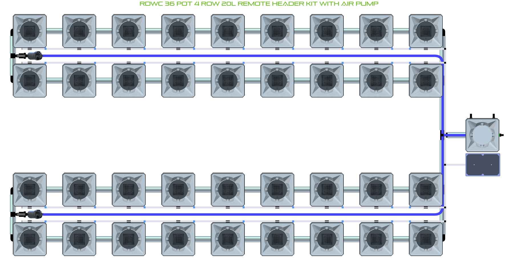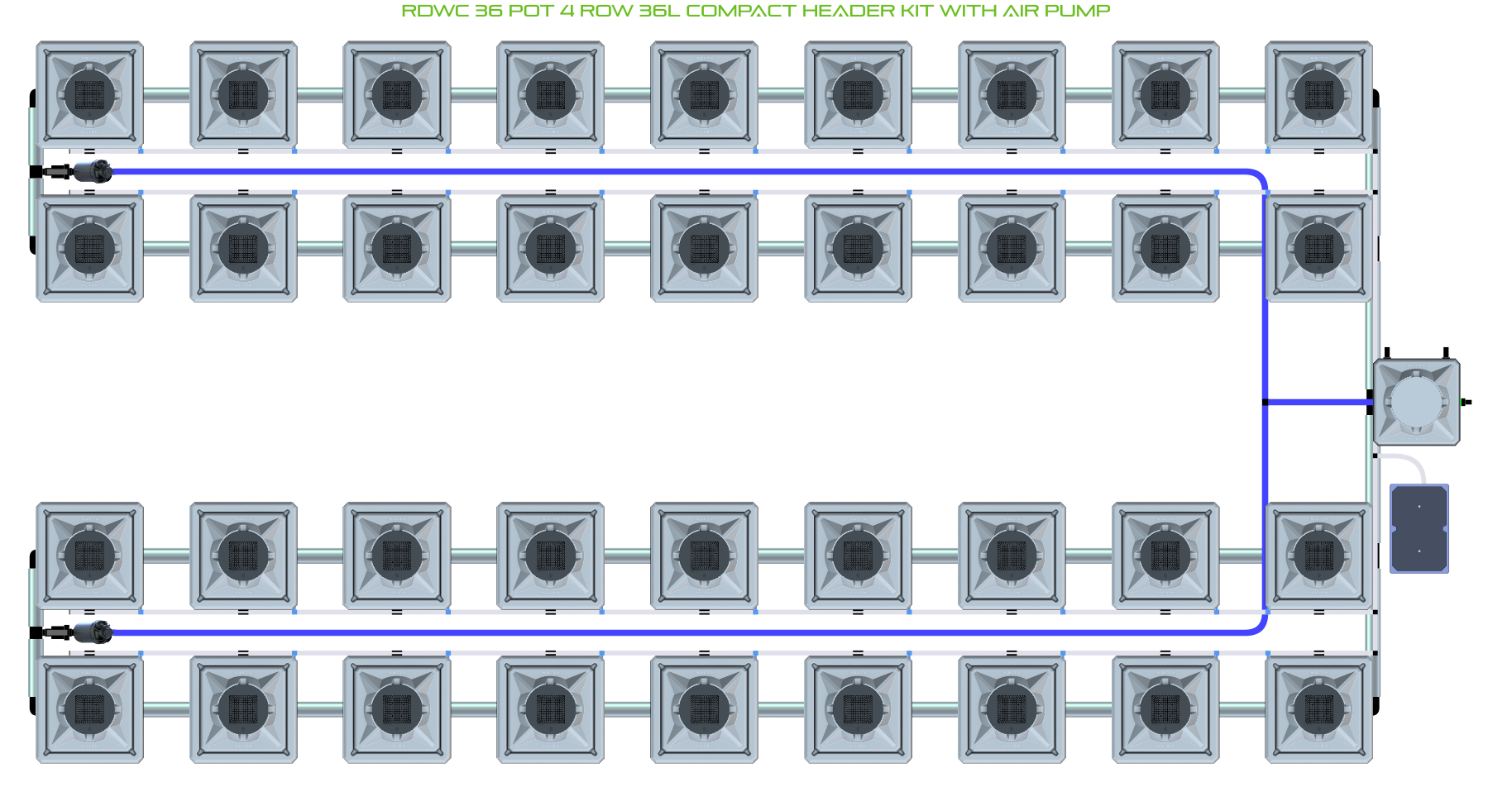 The ALIEN RDWC 36 Pot 4 Row Kit is available in 2 pot sizes and 2 header configurations, with or without an air pump (required for operation). Easy to configure and assemble with advanced features and setup options including the ability to create an aisle in the middle of rows for complete plant access, grow 36 plants to perfection in recirculating deep water culture with this ALIEN RDWC Kit!