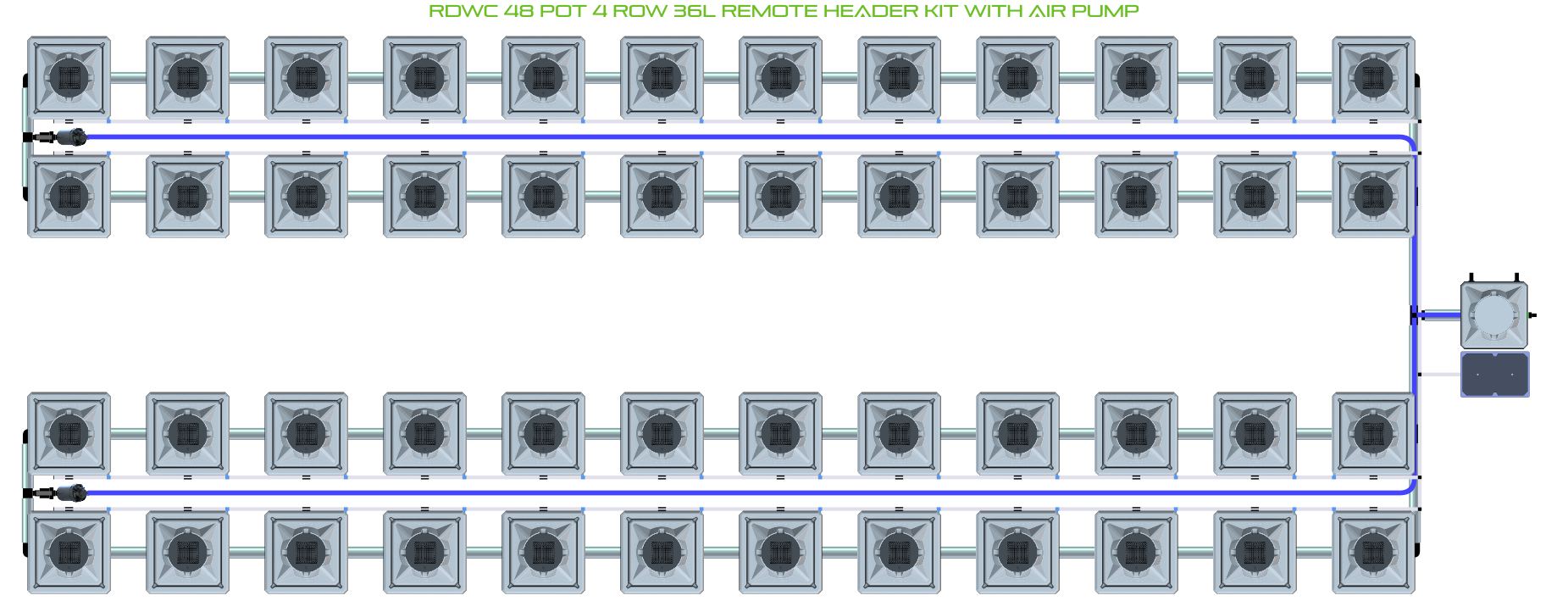 The ALIEN RDWC 48 Pot 4 Row Kit is available in 2 pot sizes and 2 header configurations, with or without an air pump (required for operation). Easy to configure and assemble with advanced features and setup options including the ability to create an aisle in the middle of rows for complete plant access, grow 48 plants to perfection in recirculating deep water culture with this ALIEN RDWC Kit!
