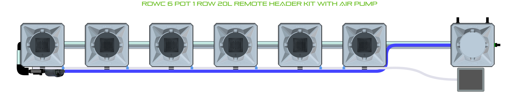 The ALIEN RDWC 6 Pot 1 Row Kit is available in 2 pot sizes and 2 header configurations, with or without an air pump (required for operation). Easy to configure and assemble with advanced features and setup options, grow 6 plants to perfection in recirculating deep water culture with this ALIEN RDWC Kit!