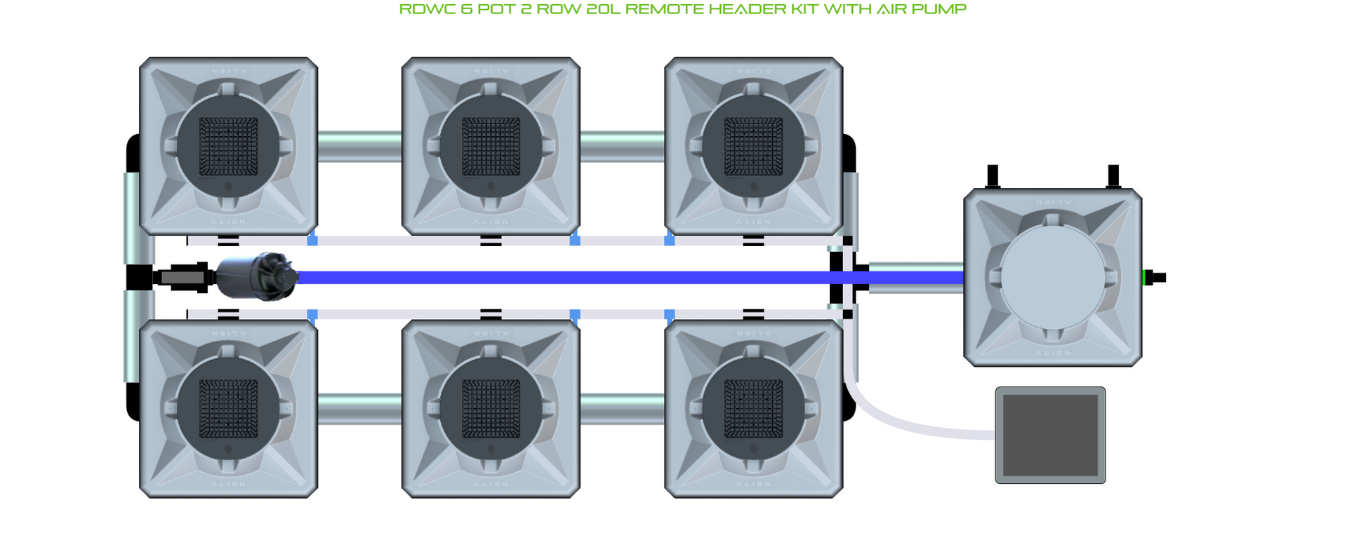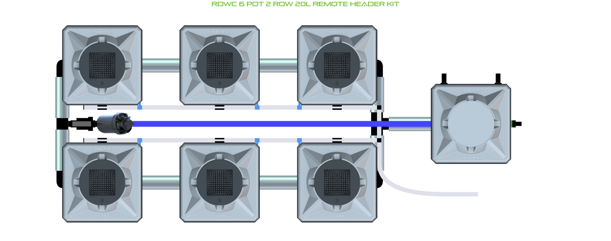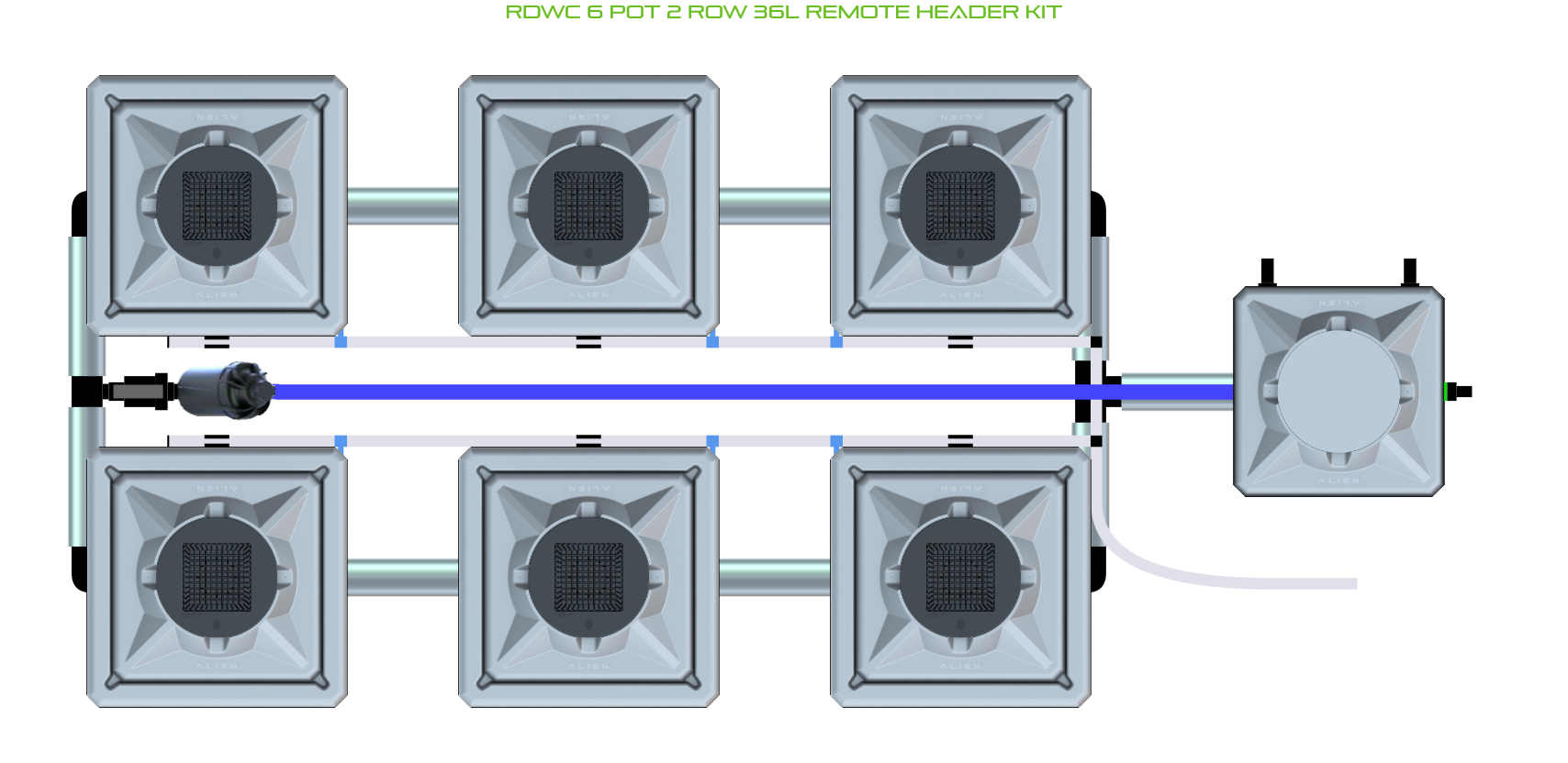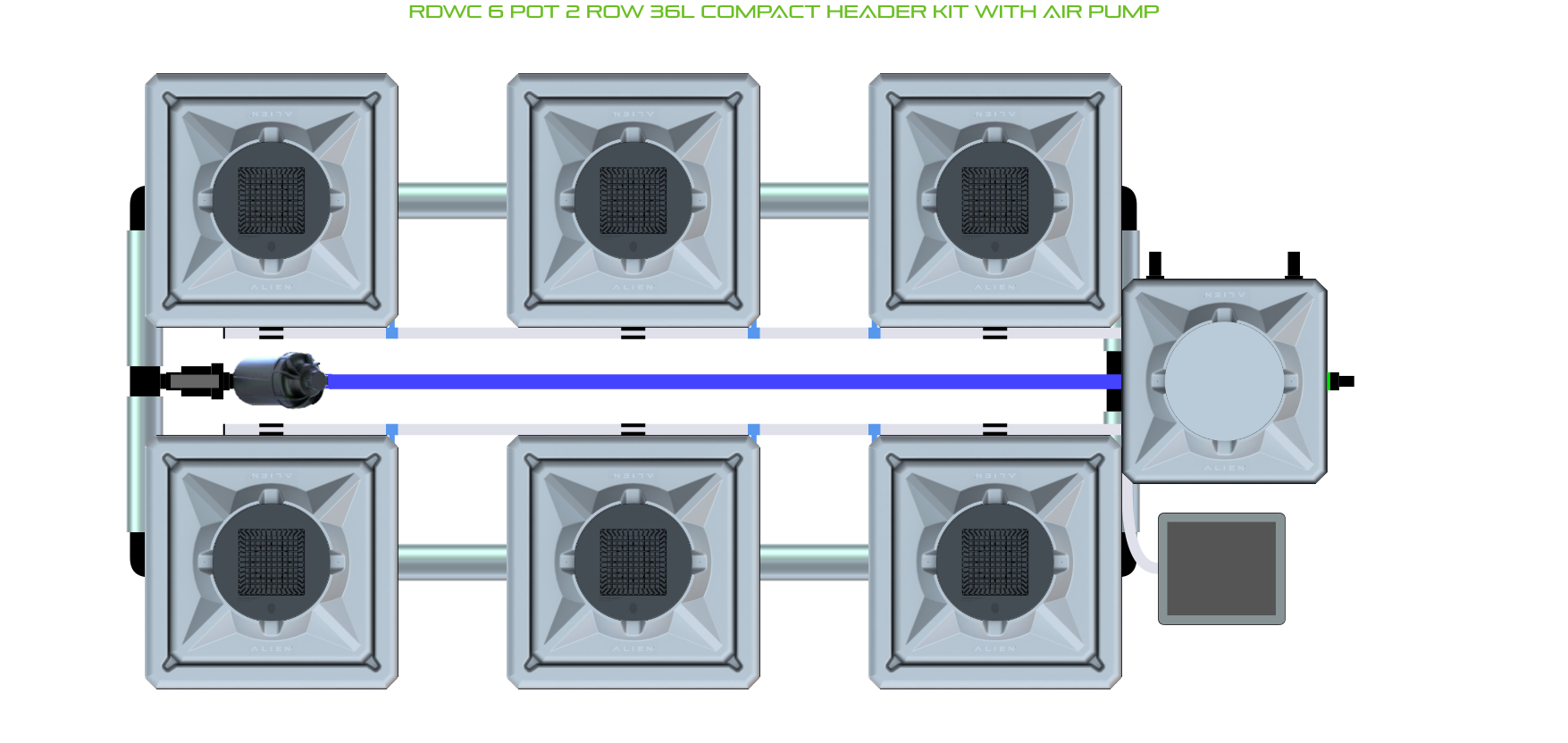 The ALIEN RDWC 6 Pot 2 Row Kit is available in 2 pot sizes and 2 header configurations, with or without an air pump (required for operation). Easy to configure and assemble with advanced features and setup options, grow 6 plants to perfection in recirculating deep water culture with this ALIEN RDWC Kit!