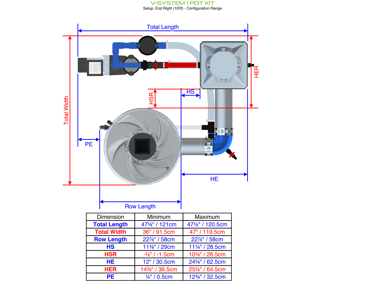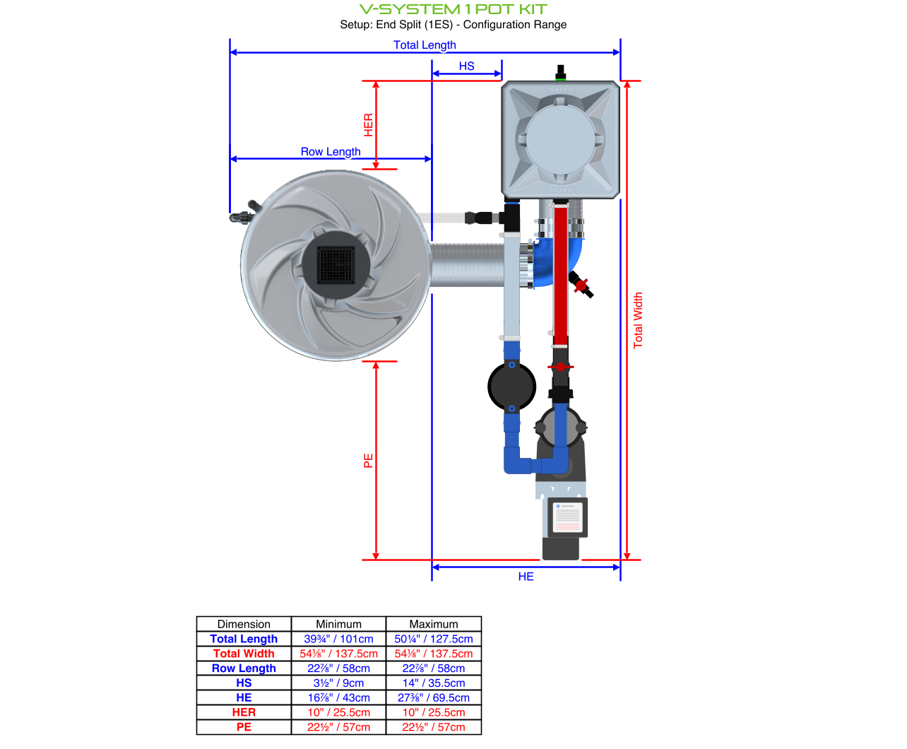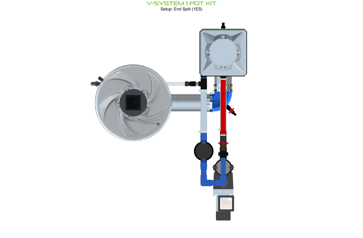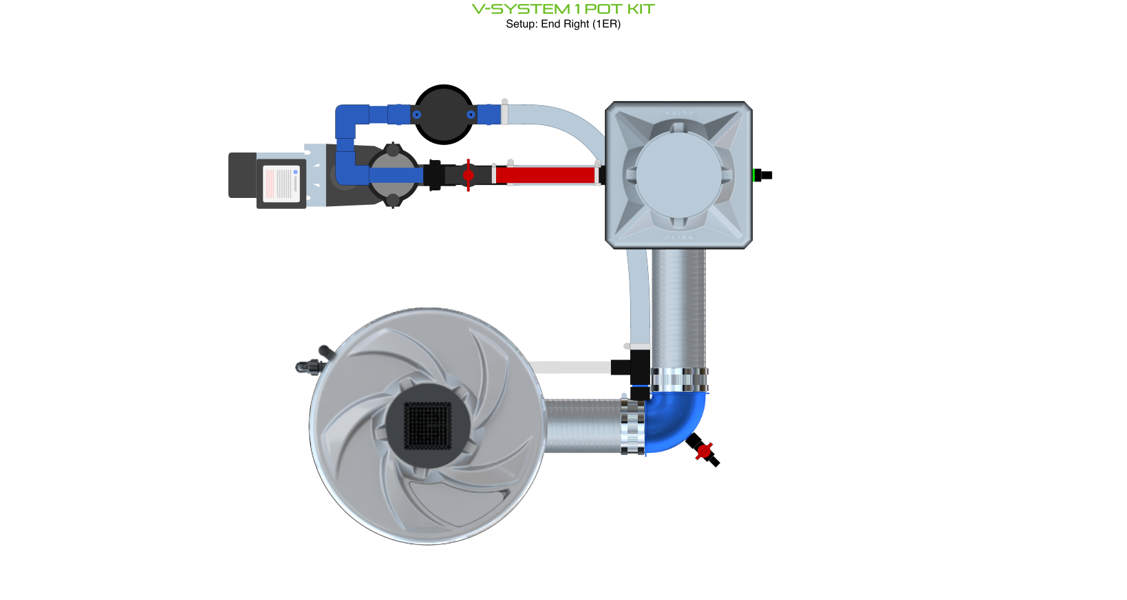 The ALIEN V-SYSTEM 1 Pot Kit has 3 layout options for header and pump placement to best fit your grow area. The header and pump can be placed outside a grow tent / room, or made as compact as possible. Easy to configure and assemble with advanced features and setup options, grow 1 plant to perfection in the ultimate recirculating deep water culture with this ALIEN V-SYSTEM Kit!