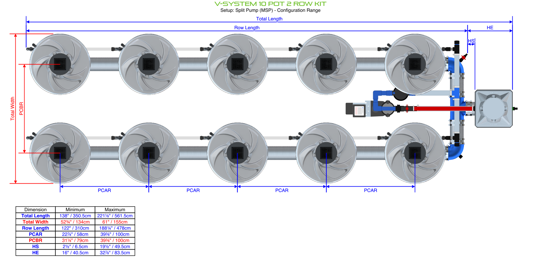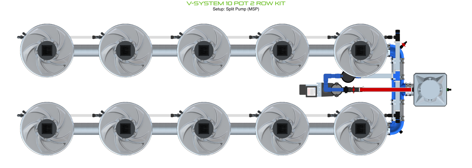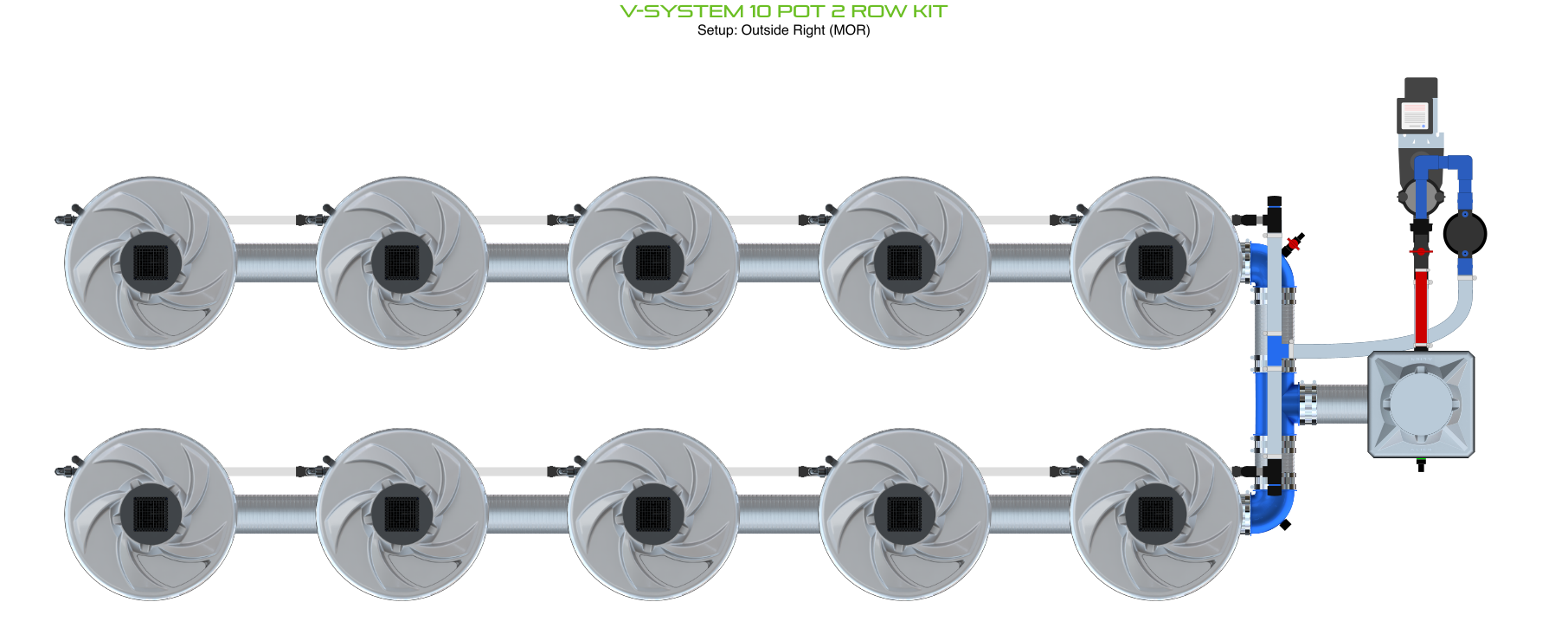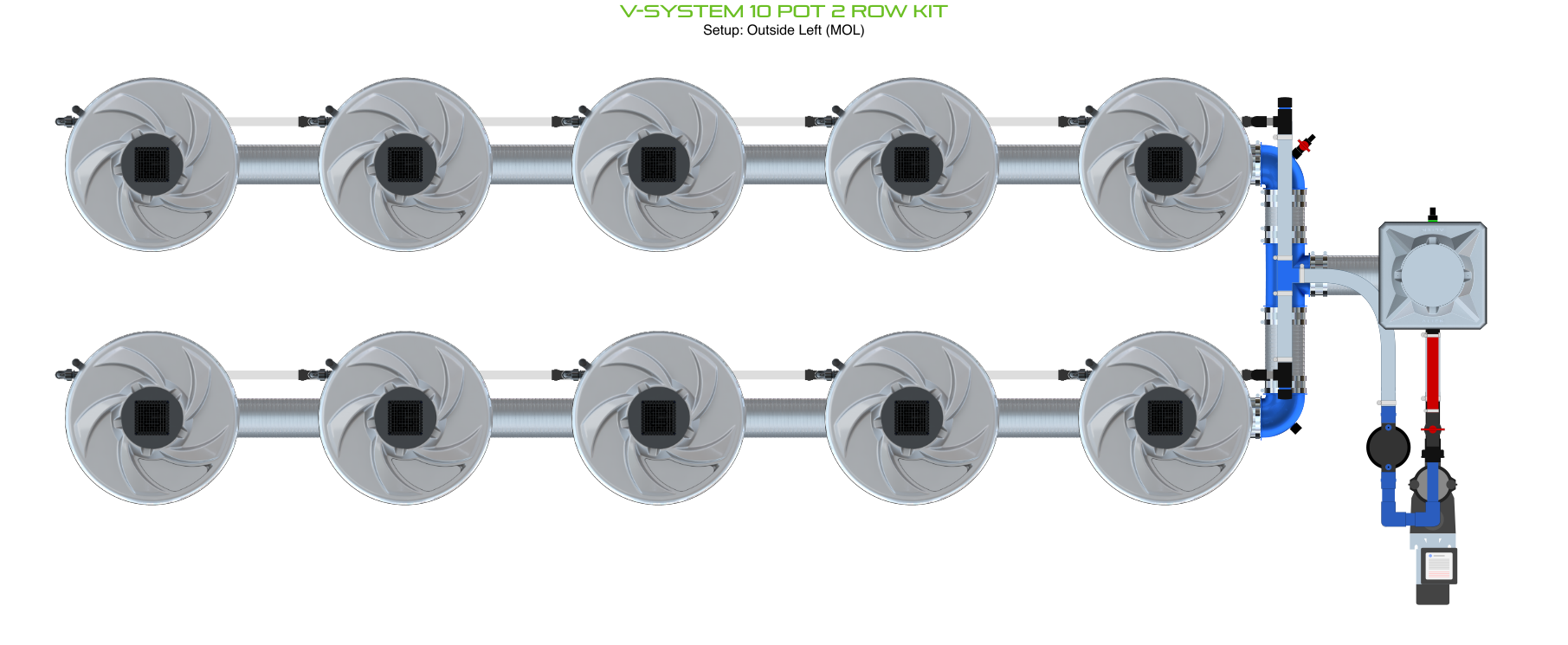 The ALIEN V-SYSTEM 10 Pot 2 Row Kit has 4 layout options for header and pump placement to best fit your grow area. The header and pump can be placed outside a grow tent / room, or made as compact as possible. Easy to configure and assemble with advanced features and setup options, grow 10 plants to perfection in the ultimate recirculating deep water culture with this ALIEN V-SYSTEM Kit!