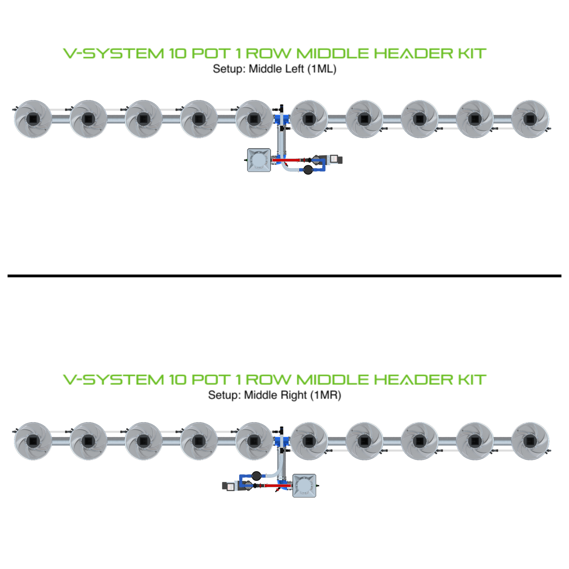 The ALIEN V-SYSTEM 10 Pot 1 Row Kit is available in two different versions, with the header either at the end of the row or in the middle. For end header kits, there are 3 layout options for header and pump placement relative to the row of pots, and 2 layout options for middle header kits. The header and pump can be placed outside a grow tent / room, or made as compact as possible. Easy to configure and assemble with advanced features and setup options, grow 10 plants to perfection in the ultimate recirculating deep water culture with this ALIEN V-SYSTEM Kit!