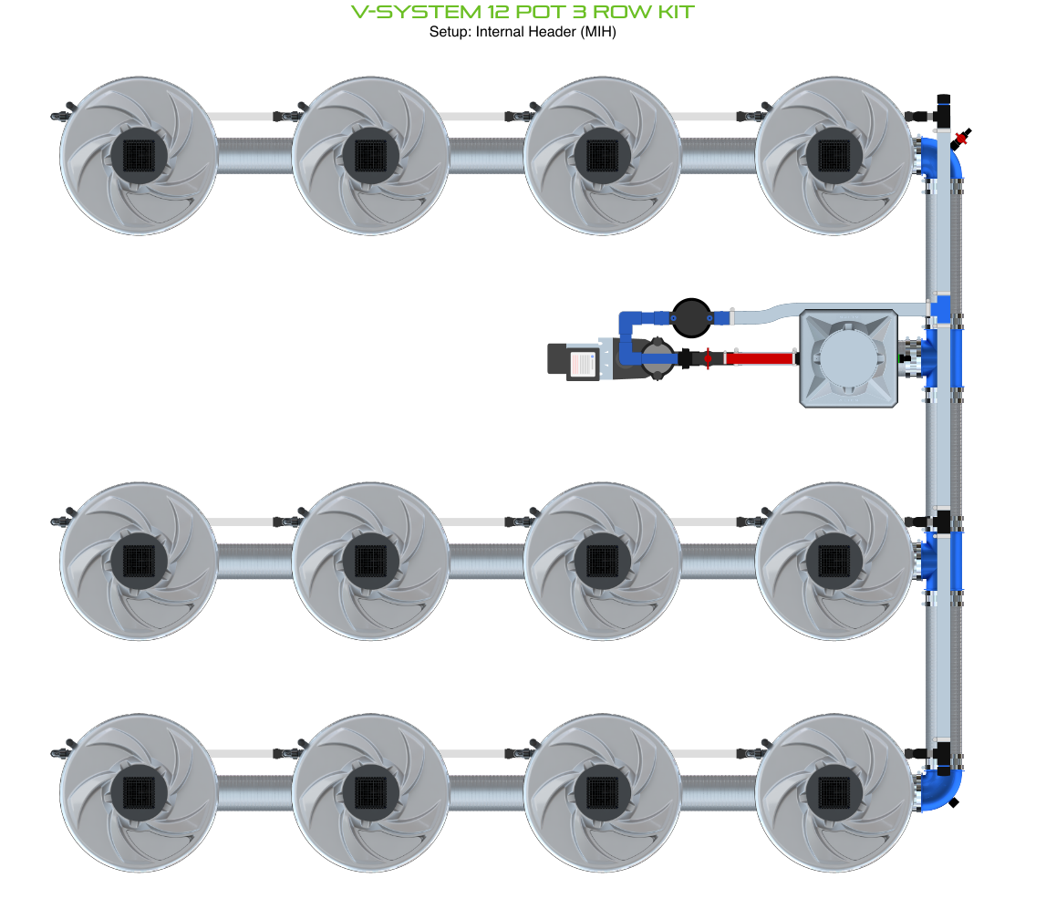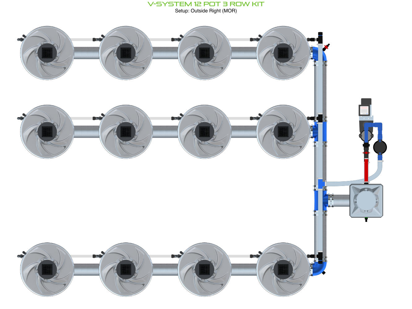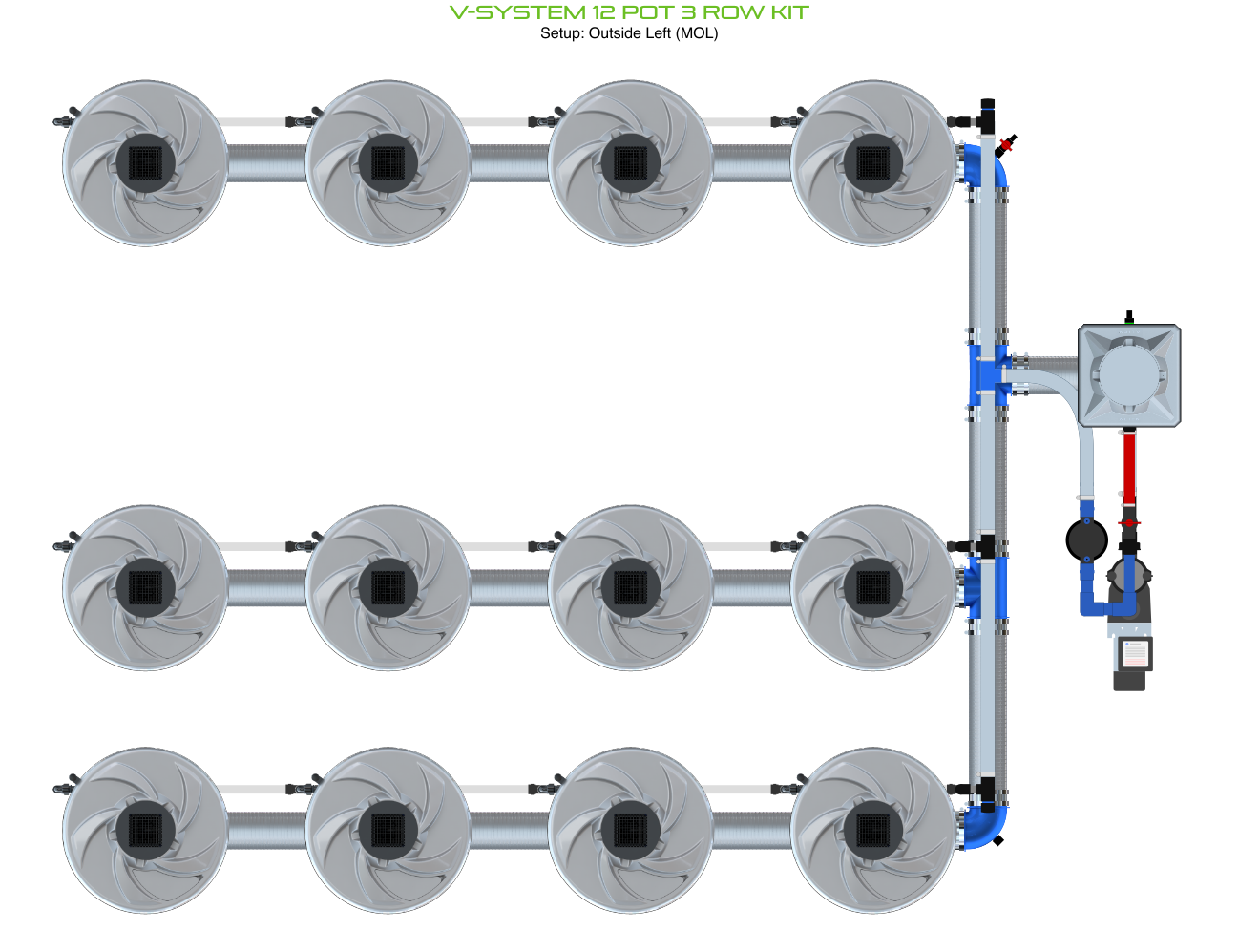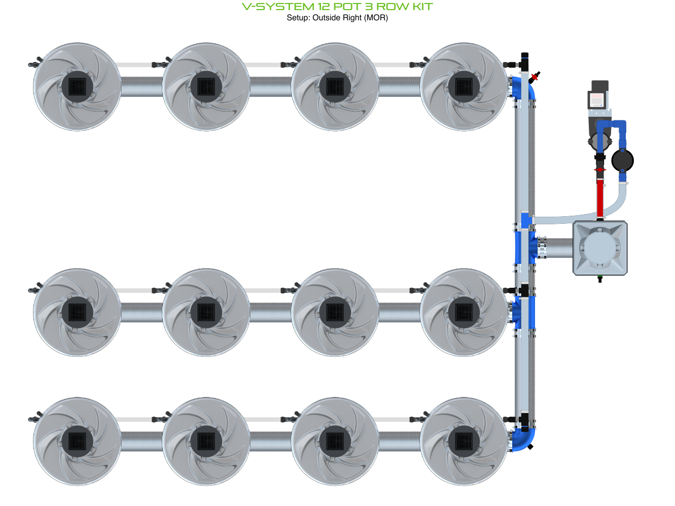 The ALIEN V-SYSTEM 12 Pot 3 Row Kit has 4 layout options for header and pump placement to best fit your grow area. The header and pump can be placed outside a grow tent / room, or made as compact as possible. Easy to configure and assemble with advanced features and setup options including the ability to create an aisle in the middle of rows for complete plant access, grow 12 plants to perfection in the ultimate recirculating deep water culture with this ALIEN V-SYSTEM Kit!