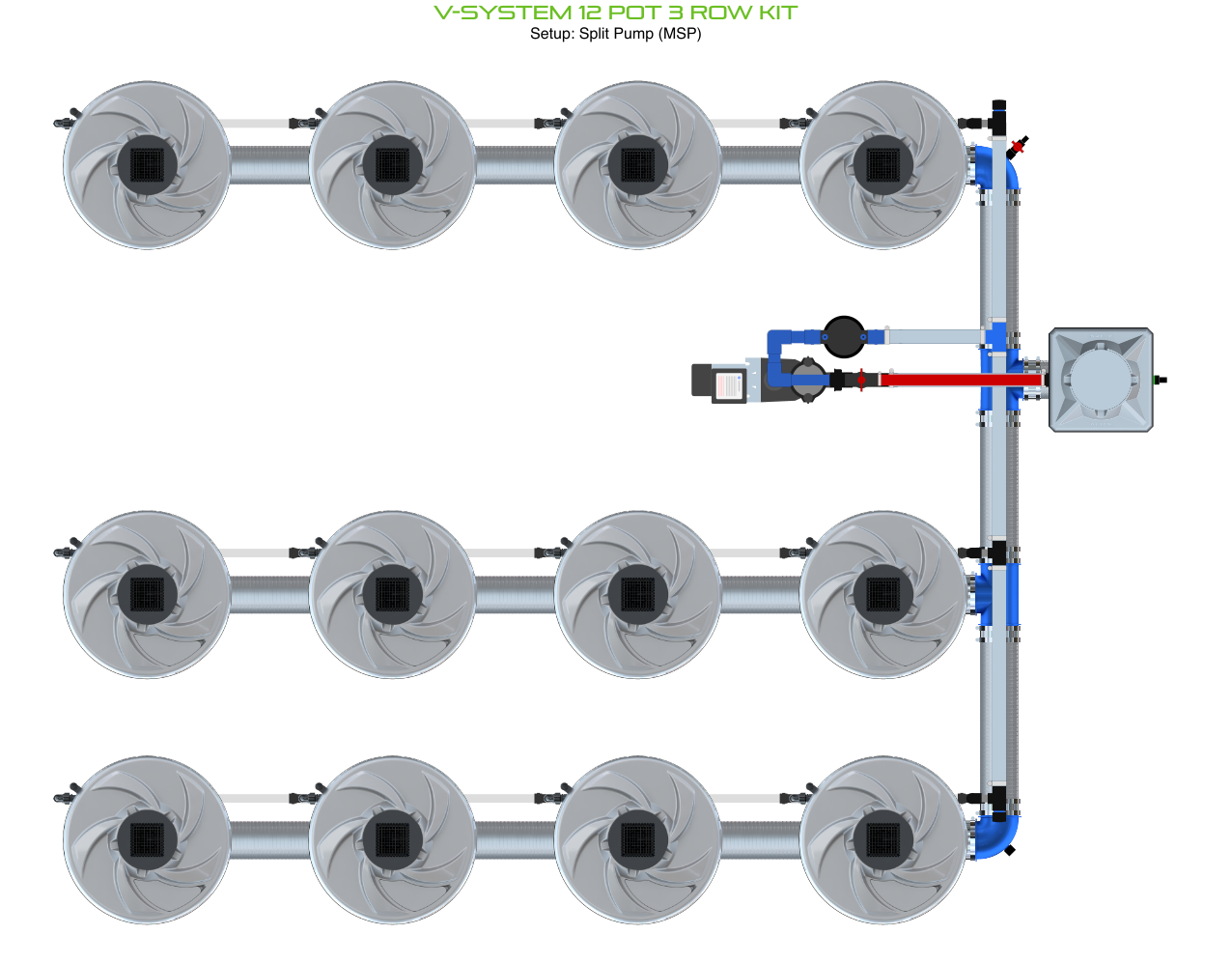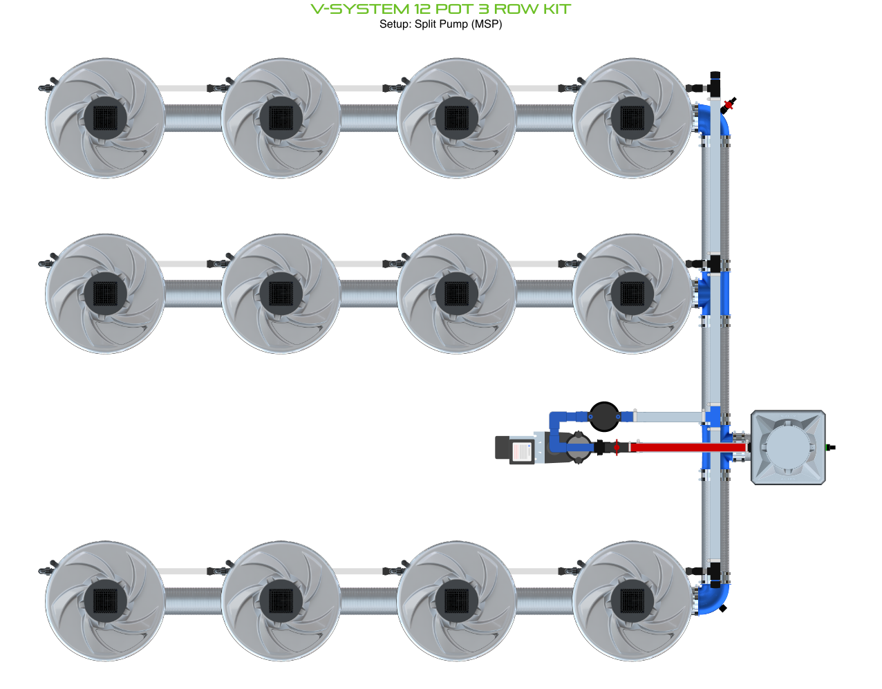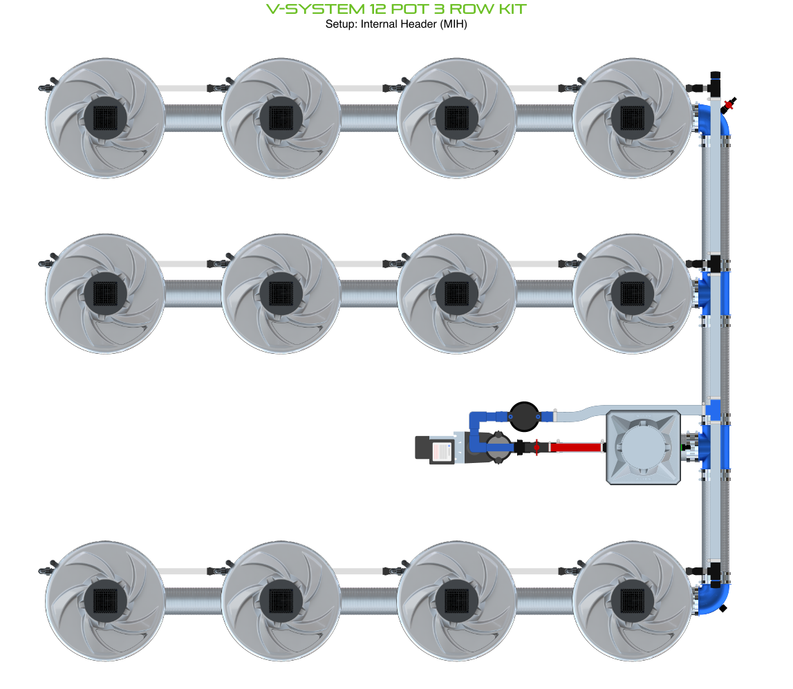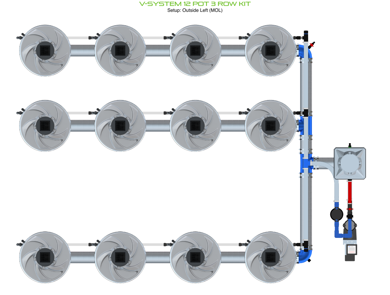 The ALIEN V-SYSTEM 12 Pot 3 Row Kit has 4 layout options for header and pump placement to best fit your grow area. The header and pump can be placed outside a grow tent / room, or made as compact as possible. Easy to configure and assemble with advanced features and setup options including the ability to create an aisle in the middle of rows for complete plant access, grow 12 plants to perfection in the ultimate recirculating deep water culture with this ALIEN V-SYSTEM Kit!