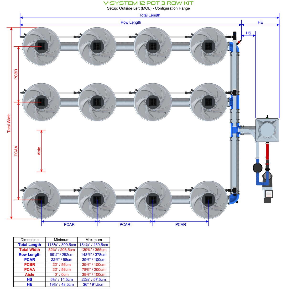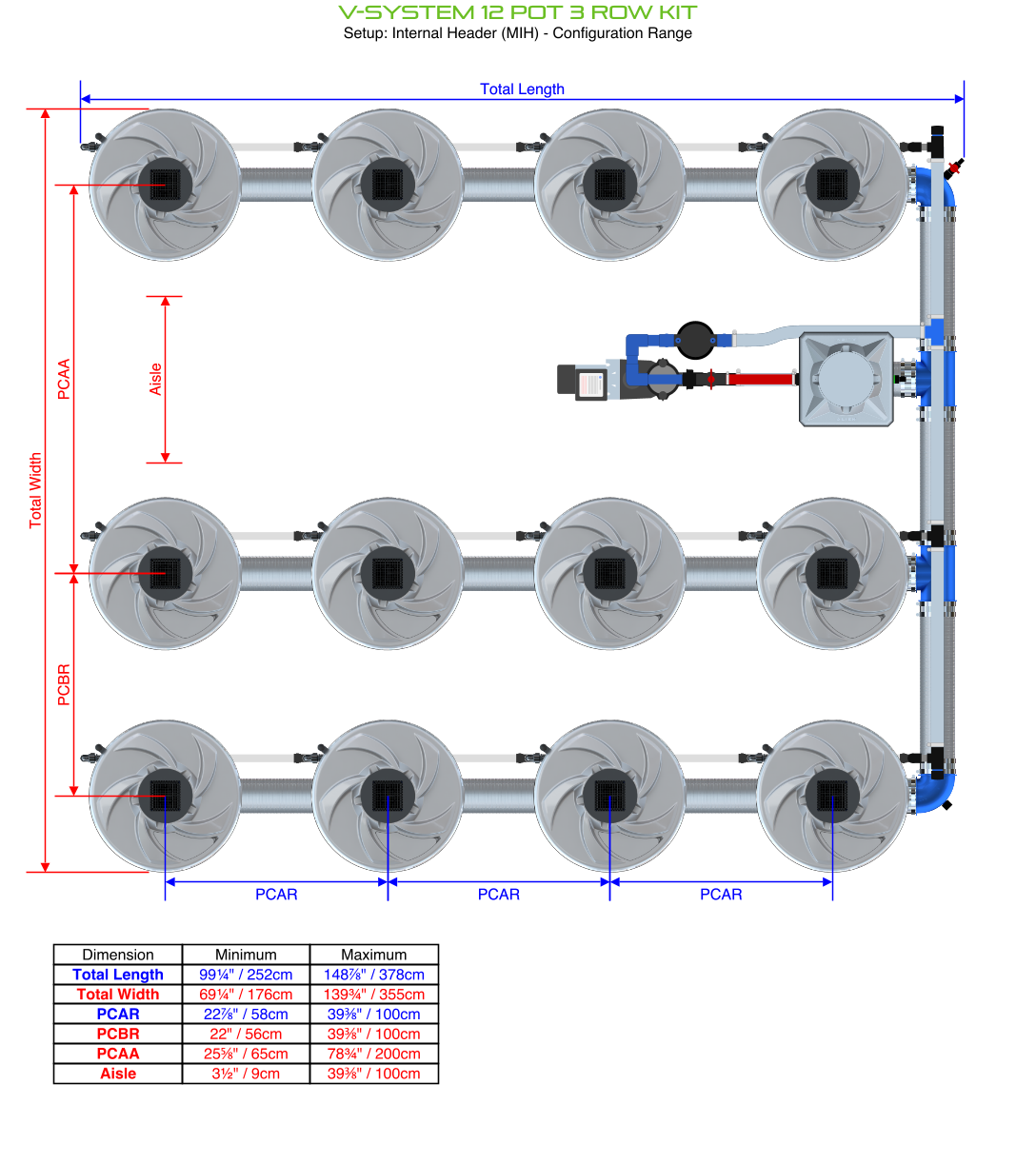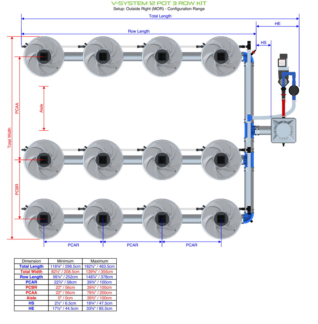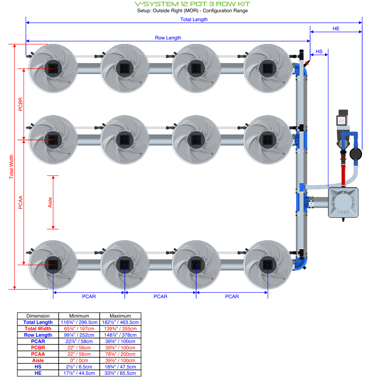 The ALIEN V-SYSTEM 12 Pot 3 Row Kit has 4 layout options for header and pump placement to best fit your grow area. The header and pump can be placed outside a grow tent / room, or made as compact as possible. Easy to configure and assemble with advanced features and setup options including the ability to create an aisle in the middle of rows for complete plant access, grow 12 plants to perfection in the ultimate recirculating deep water culture with this ALIEN V-SYSTEM Kit!