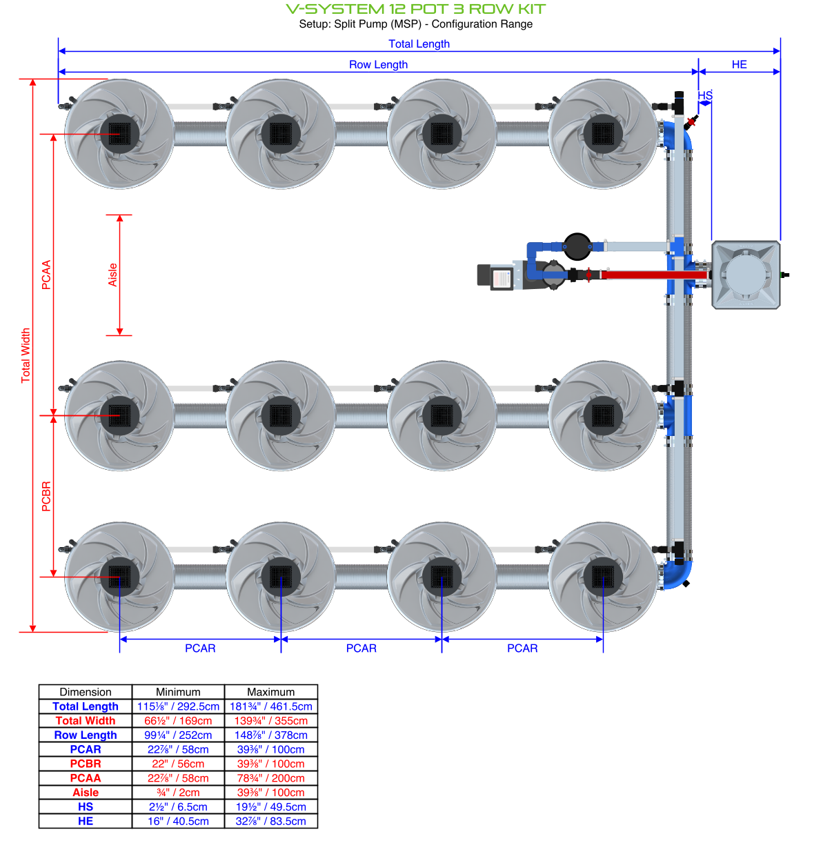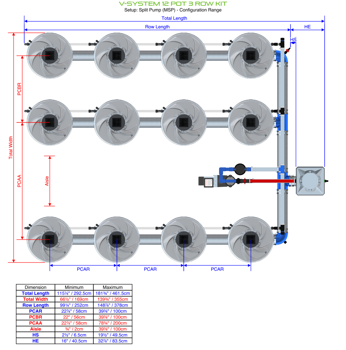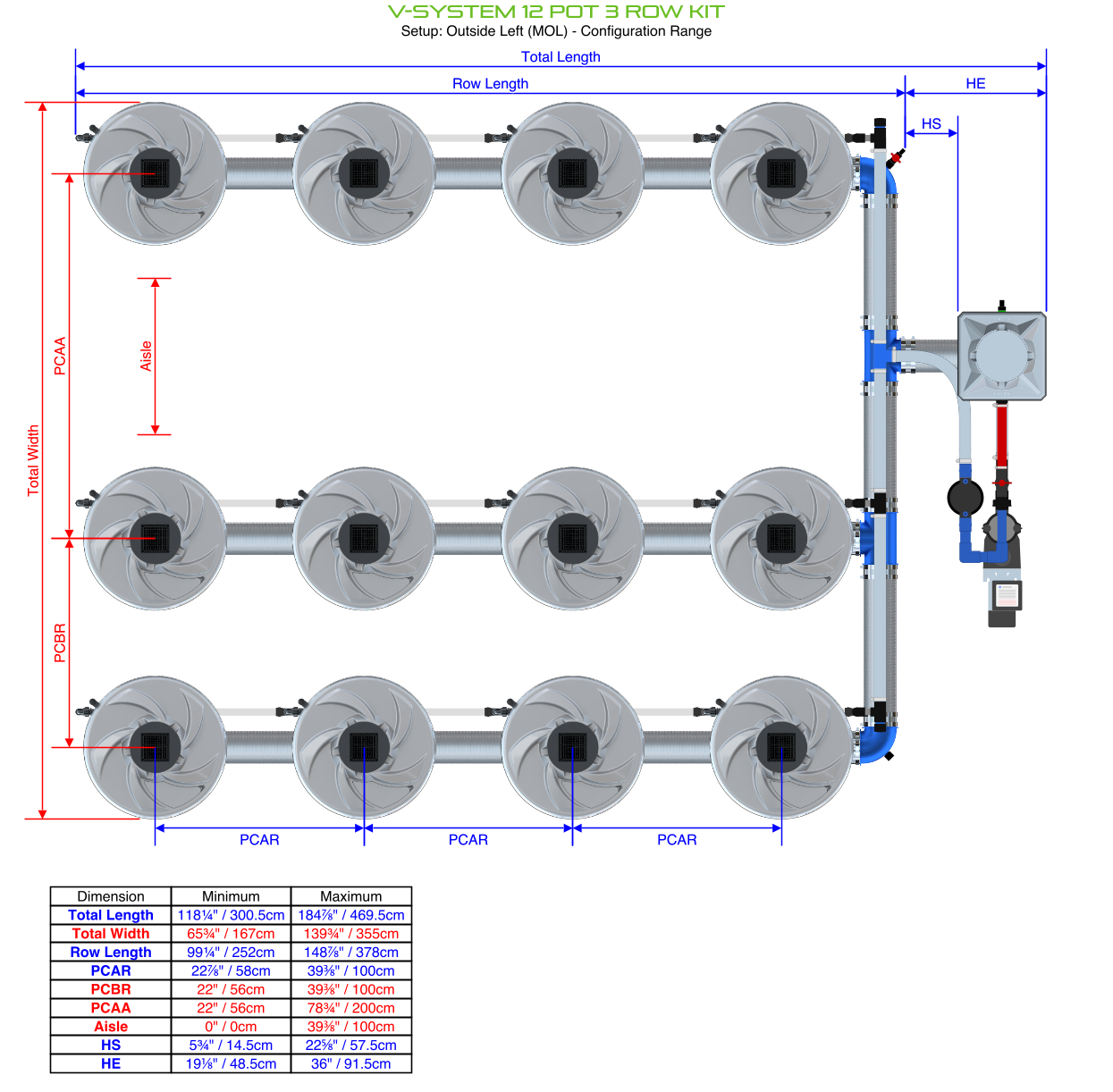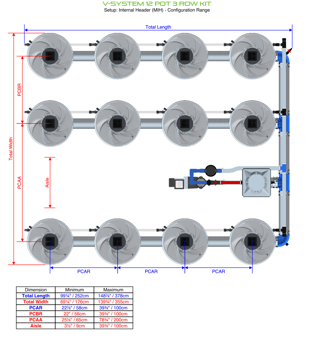 The ALIEN V-SYSTEM 12 Pot 3 Row Kit has 4 layout options for header and pump placement to best fit your grow area. The header and pump can be placed outside a grow tent / room, or made as compact as possible. Easy to configure and assemble with advanced features and setup options including the ability to create an aisle in the middle of rows for complete plant access, grow 12 plants to perfection in the ultimate recirculating deep water culture with this ALIEN V-SYSTEM Kit!