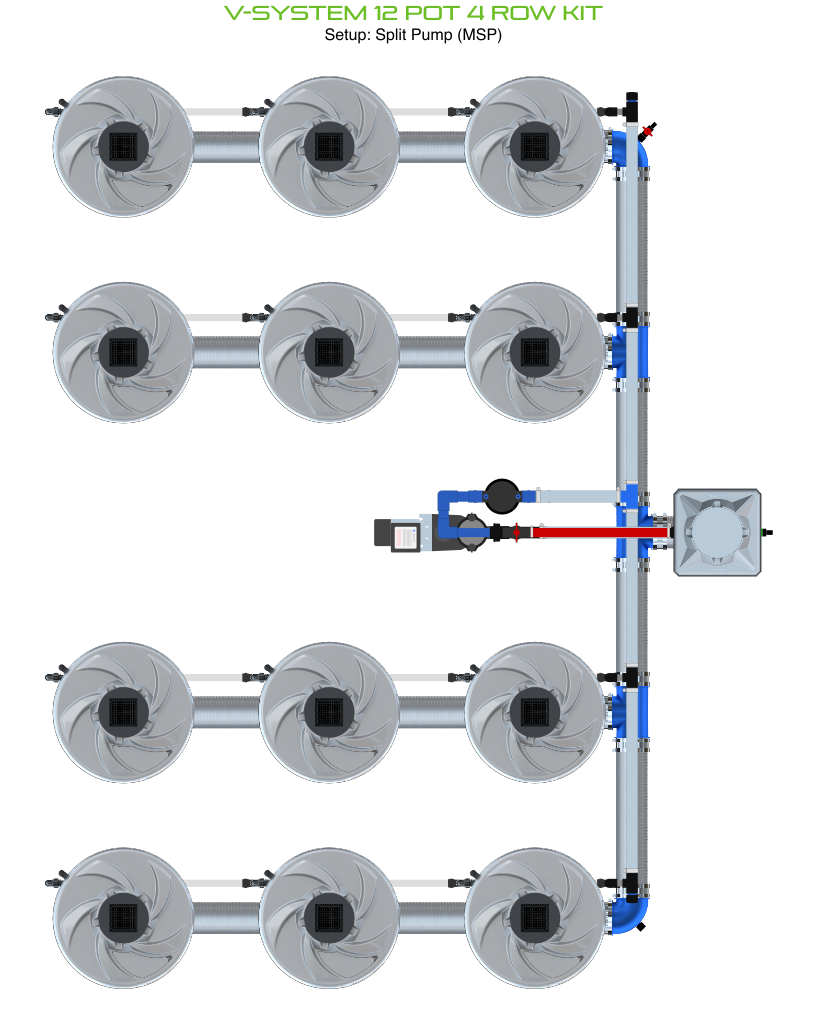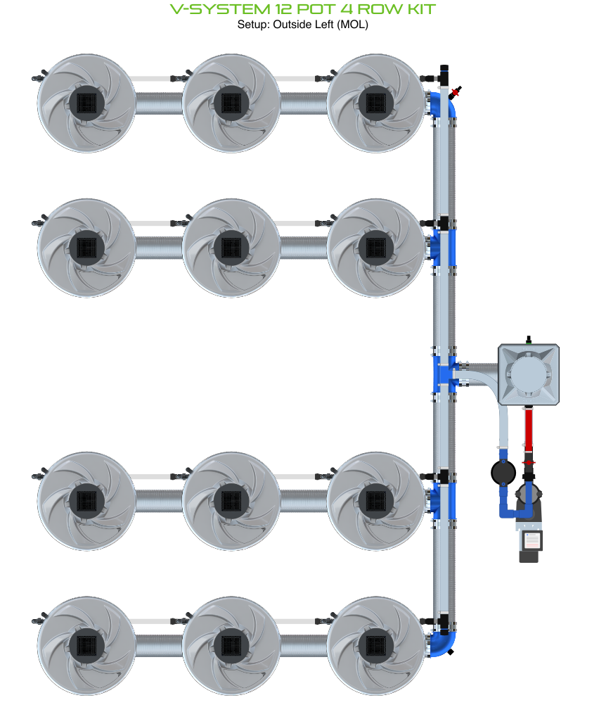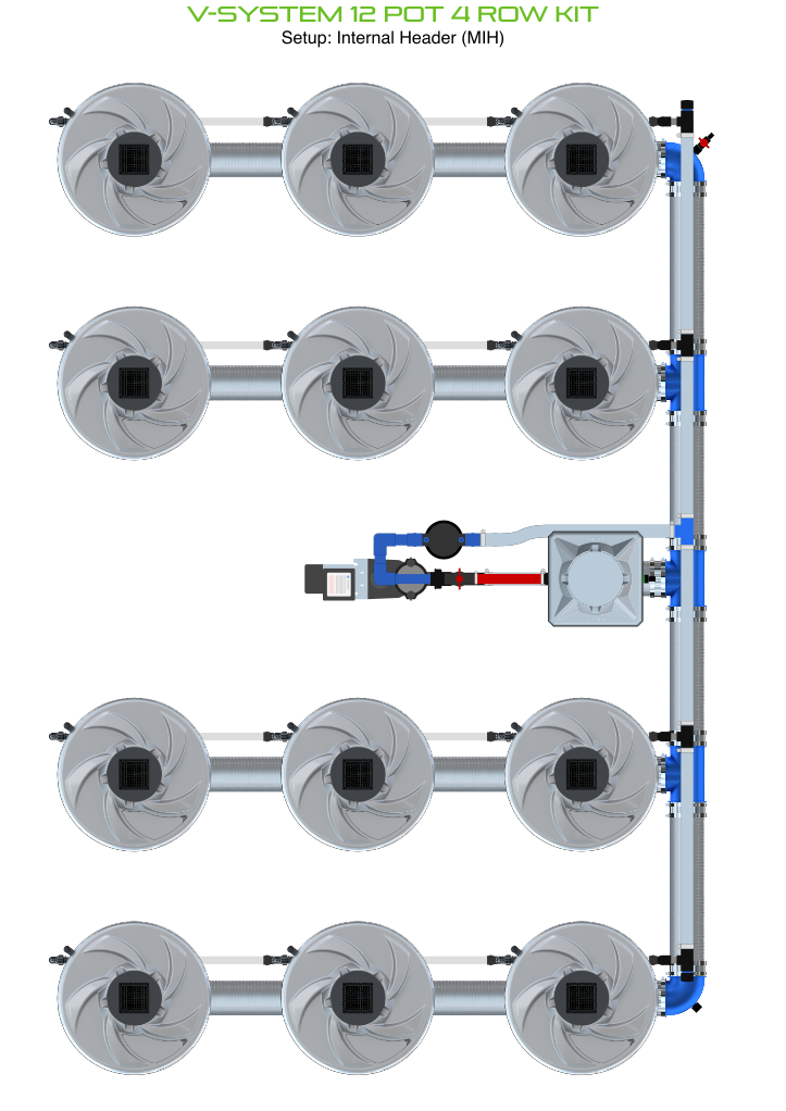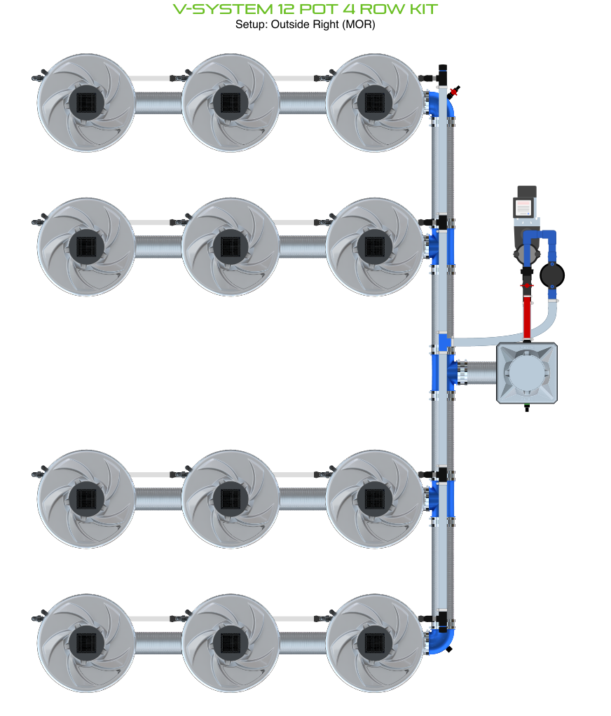 The ALIEN V-SYSTEM 12 Pot 4 Row Kit has 4 layout options for header and pump placement to best fit your grow area. The header and pump can be placed outside a grow tent / room, or made as compact as possible. Easy to configure and assemble with advanced features and setup options including the ability to create an aisle in the middle of rows for complete plant access, grow 12 plants to perfection in the ultimate recirculating deep water culture with this ALIEN V-SYSTEM Kit!