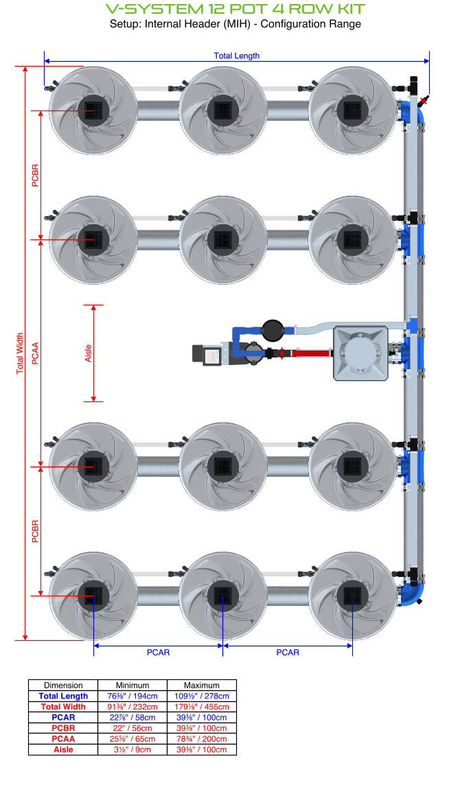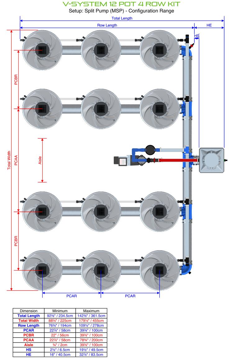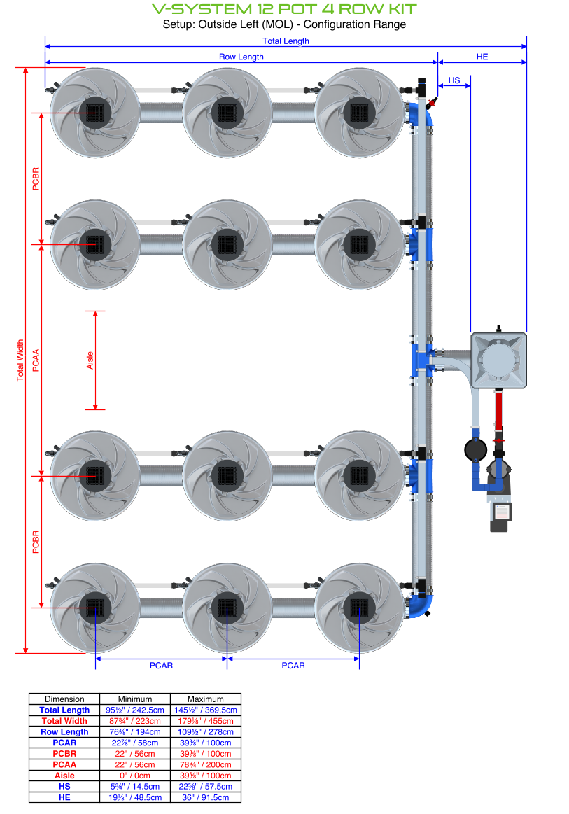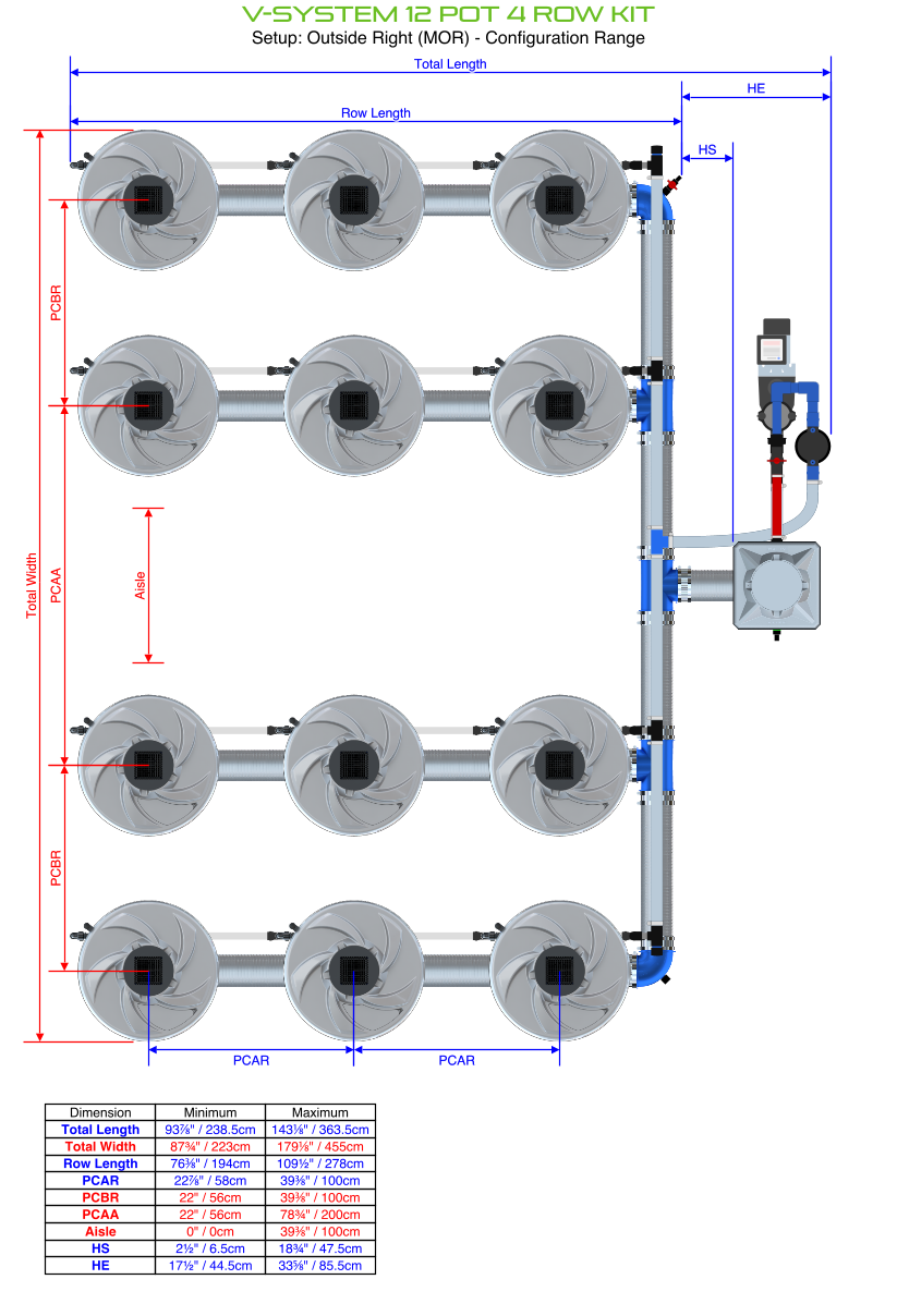 The ALIEN V-SYSTEM 12 Pot 4 Row Kit has 4 layout options for header and pump placement to best fit your grow area. The header and pump can be placed outside a grow tent / room, or made as compact as possible. Easy to configure and assemble with advanced features and setup options including the ability to create an aisle in the middle of rows for complete plant access, grow 12 plants to perfection in the ultimate recirculating deep water culture with this ALIEN V-SYSTEM Kit!