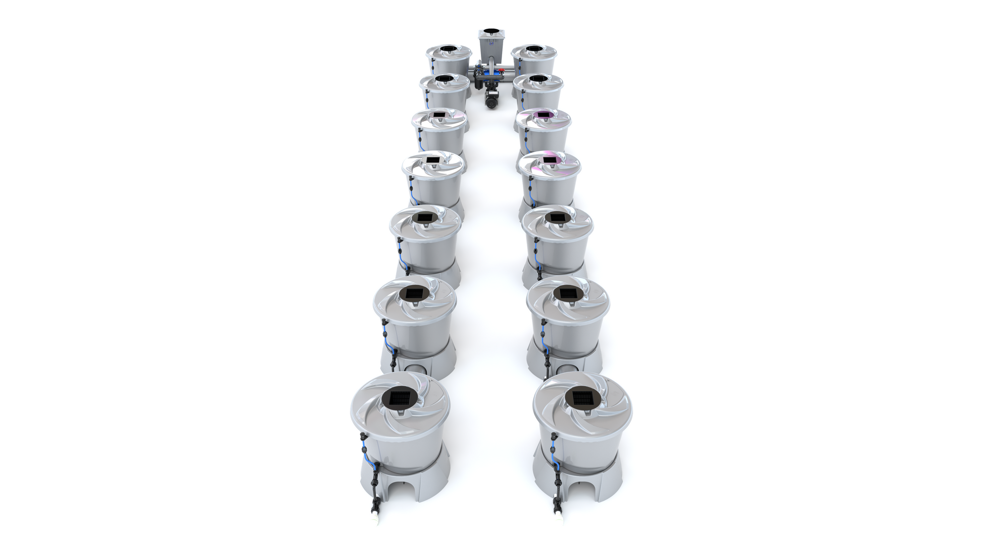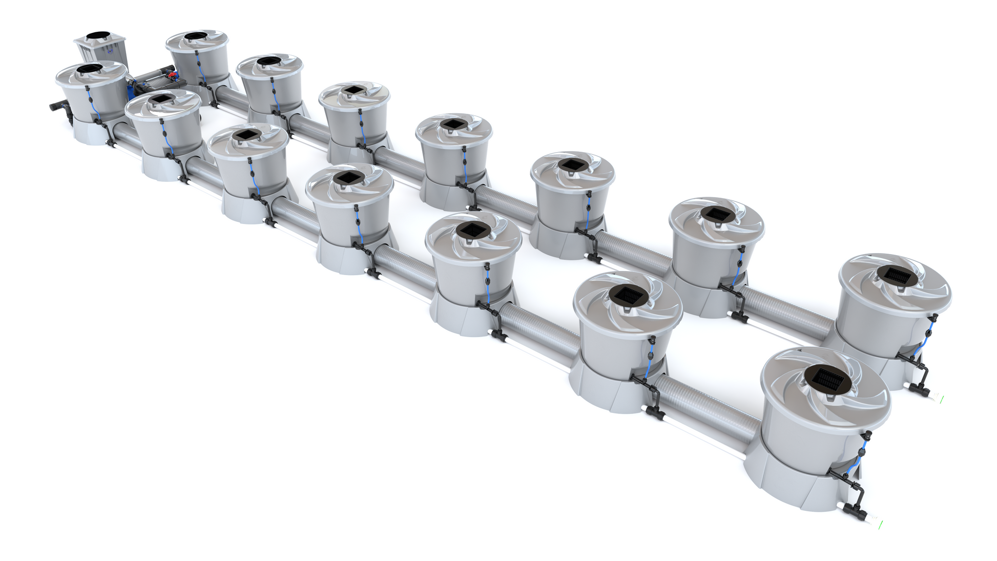 The ALIEN V-SYSTEM 14 Pot 2 Row Kit has 4 layout options for header and pump placement to best fit your grow area. The header and pump can be placed outside a grow tent / room, or made as compact as possible. Easy to configure and assemble with advanced features and setup options, grow 14 plants to perfection in the ultimate recirculating deep water culture with this ALIEN V-SYSTEM Kit!