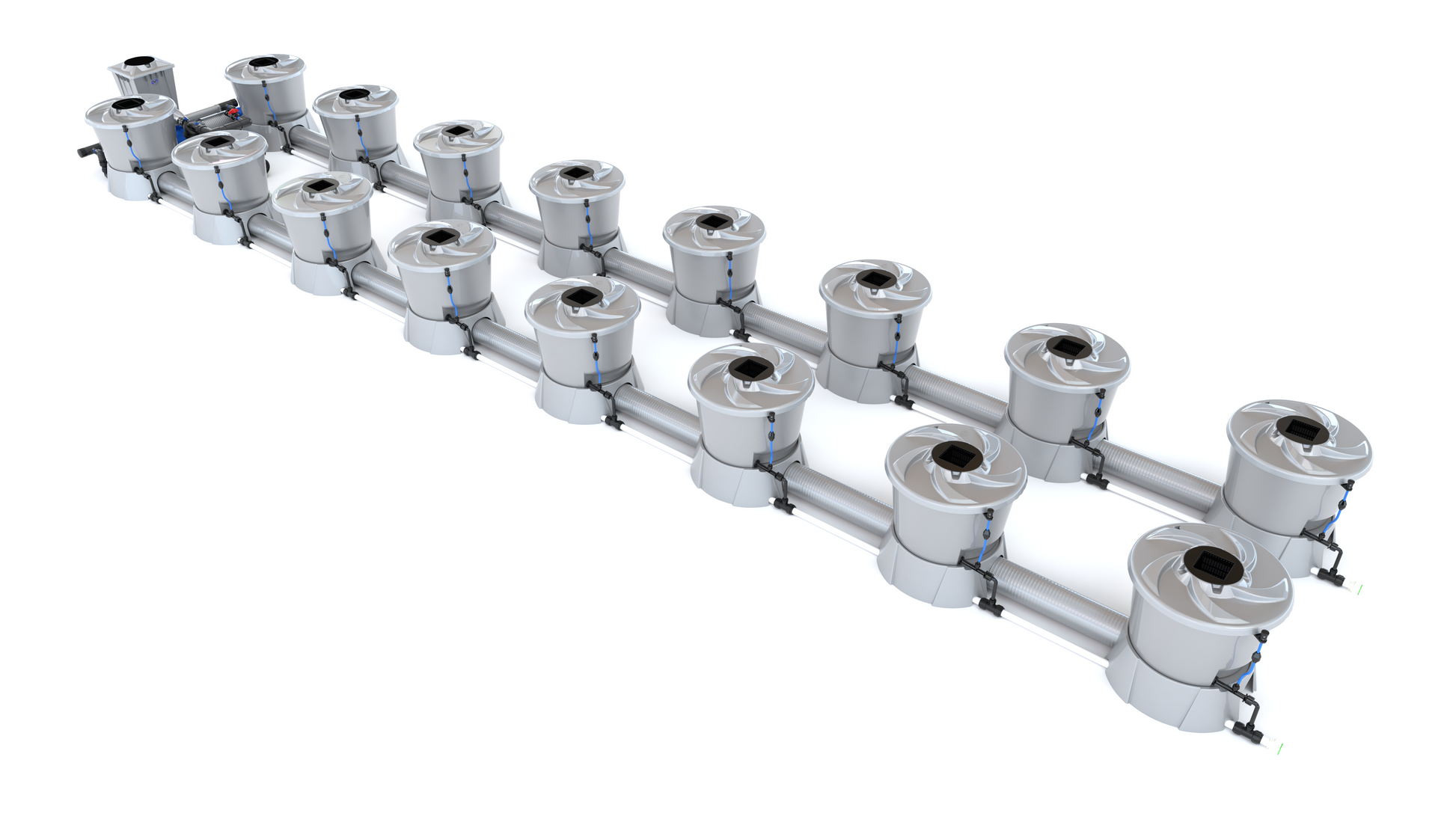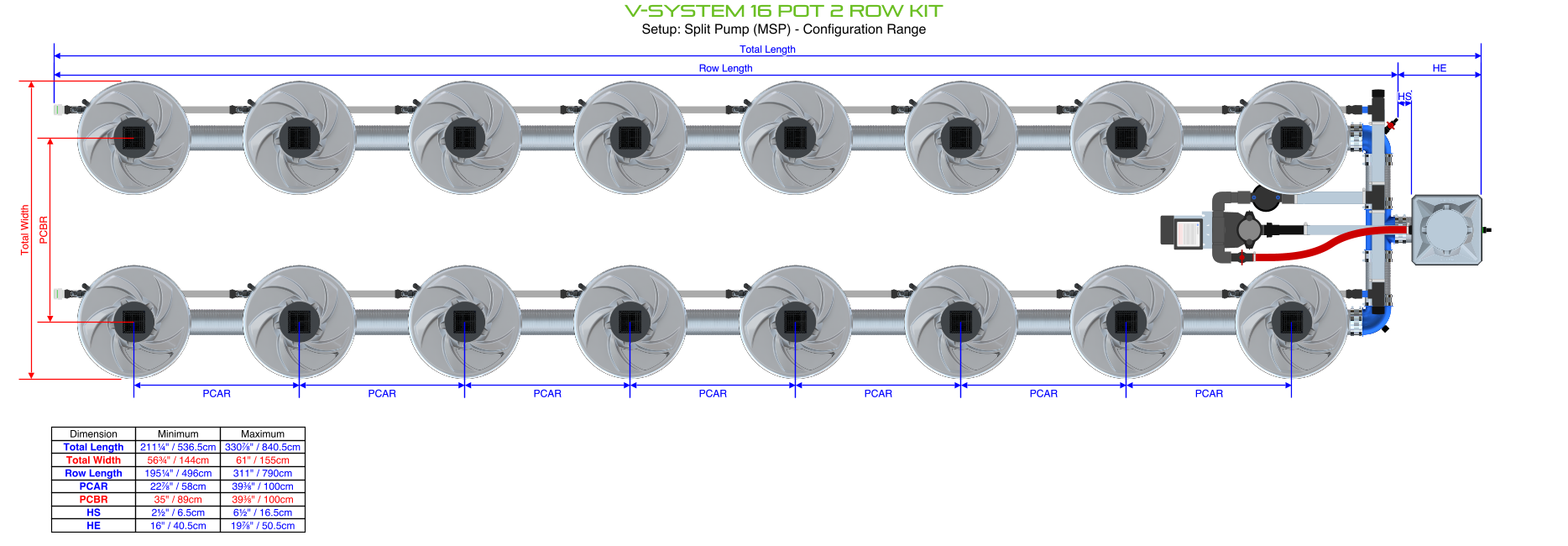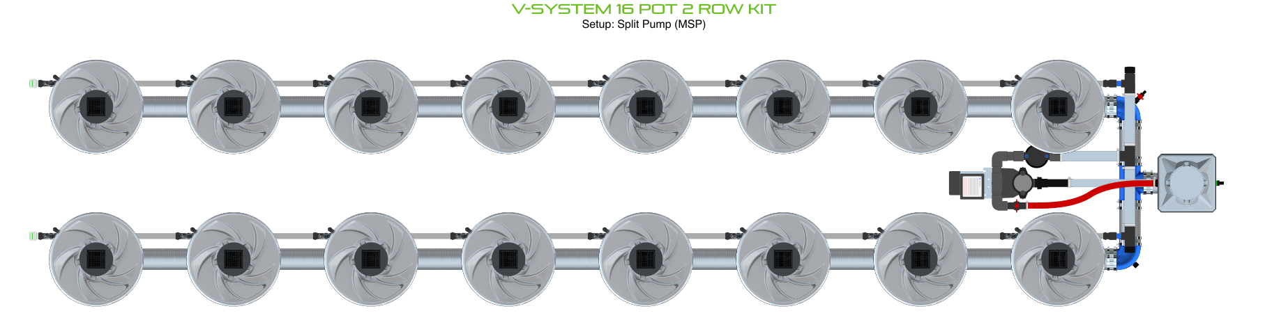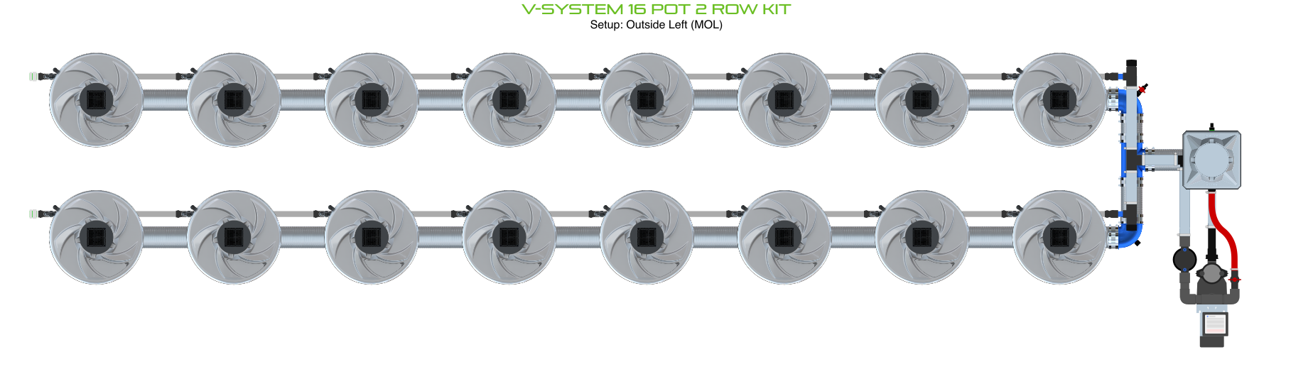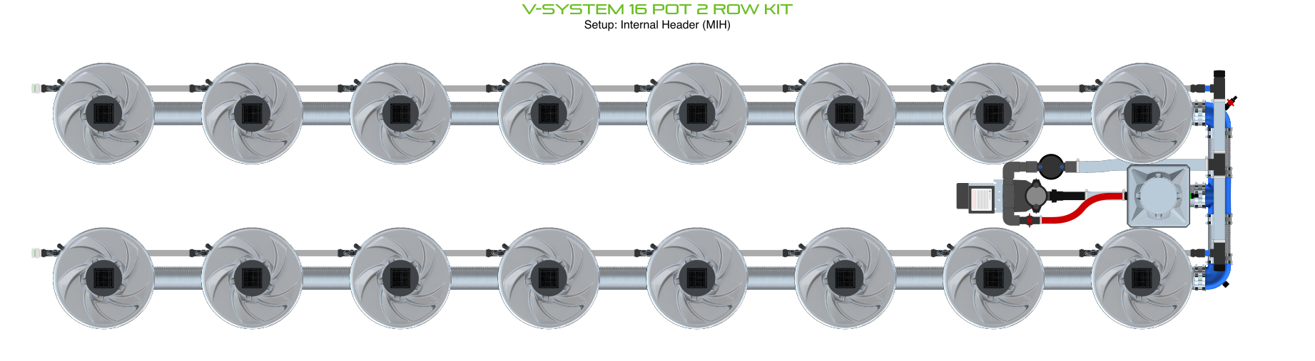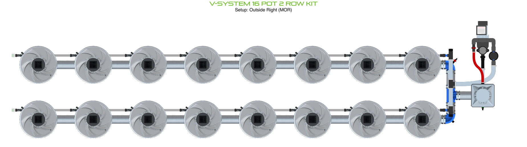 The ALIEN V-SYSTEM 16 Pot 2 Row Kit has 4 layout options for header and pump placement to best fit your grow area. The header and pump can be placed outside a grow tent / room, or made as compact as possible. Easy to configure and assemble with advanced features and setup options, grow 16 plants to perfection in the ultimate recirculating deep water culture with this ALIEN V-SYSTEM Kit!