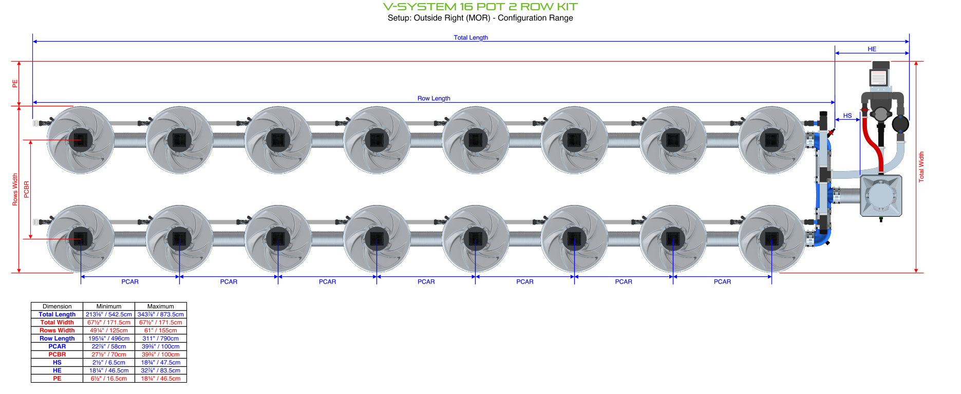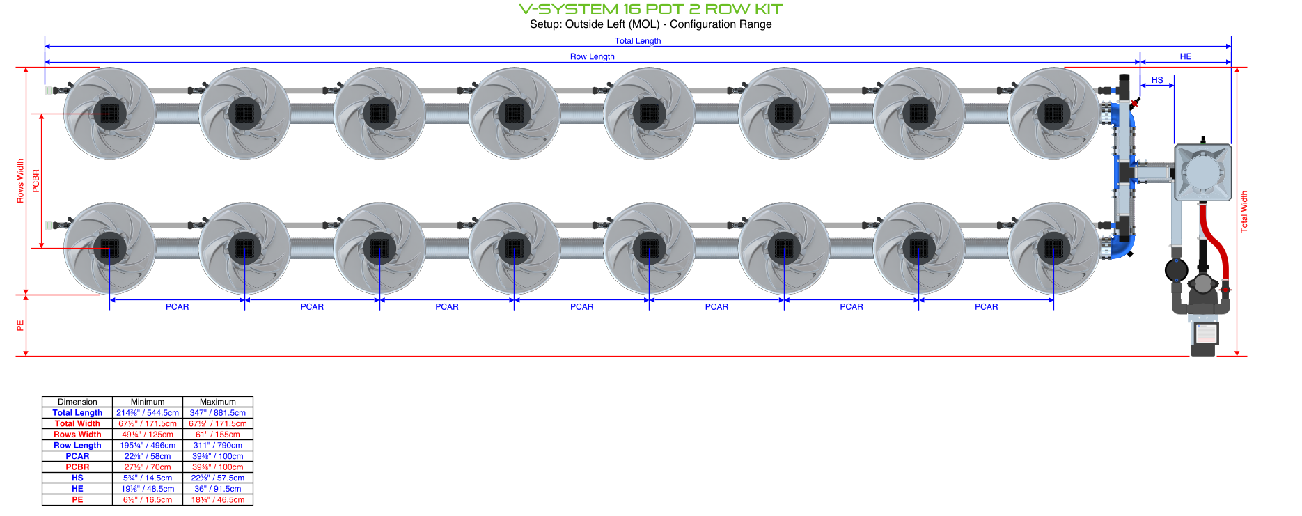?This Configurator is locked to Kits; Click here for the full Configurator?Multi-row RDWC kits with only one pot per row are only available in the 36L pot size as the 20L pots don't allow enough space for the filter.?Multi-row RDWC kits with only one pot per row are only available with a remote header (a compact header can't fit)?Header position must be 'middle' for 1-row V-SYSTEM kits with more than 10 pots, and 'end' for 1 pot kits.