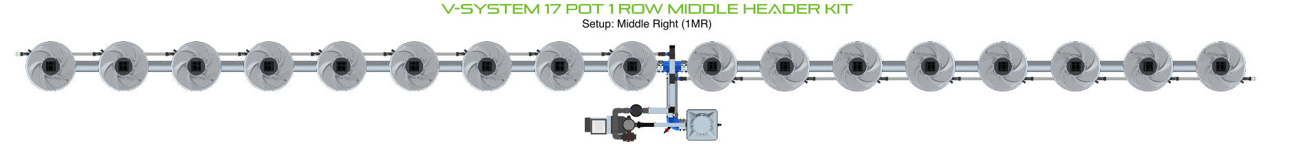 The ALIEN V-SYSTEM 17 Pot 1 Row Kit has 2 layout options for header and pump placement to best fit your grow area. The header and pump can be placed outside a grow tent / room, or made as compact as possible. Easy to configure and assemble with advanced features and setup options, grow 17 plants to perfection in the ultimate recirculating deep water culture with this ALIEN V-SYSTEM Kit!