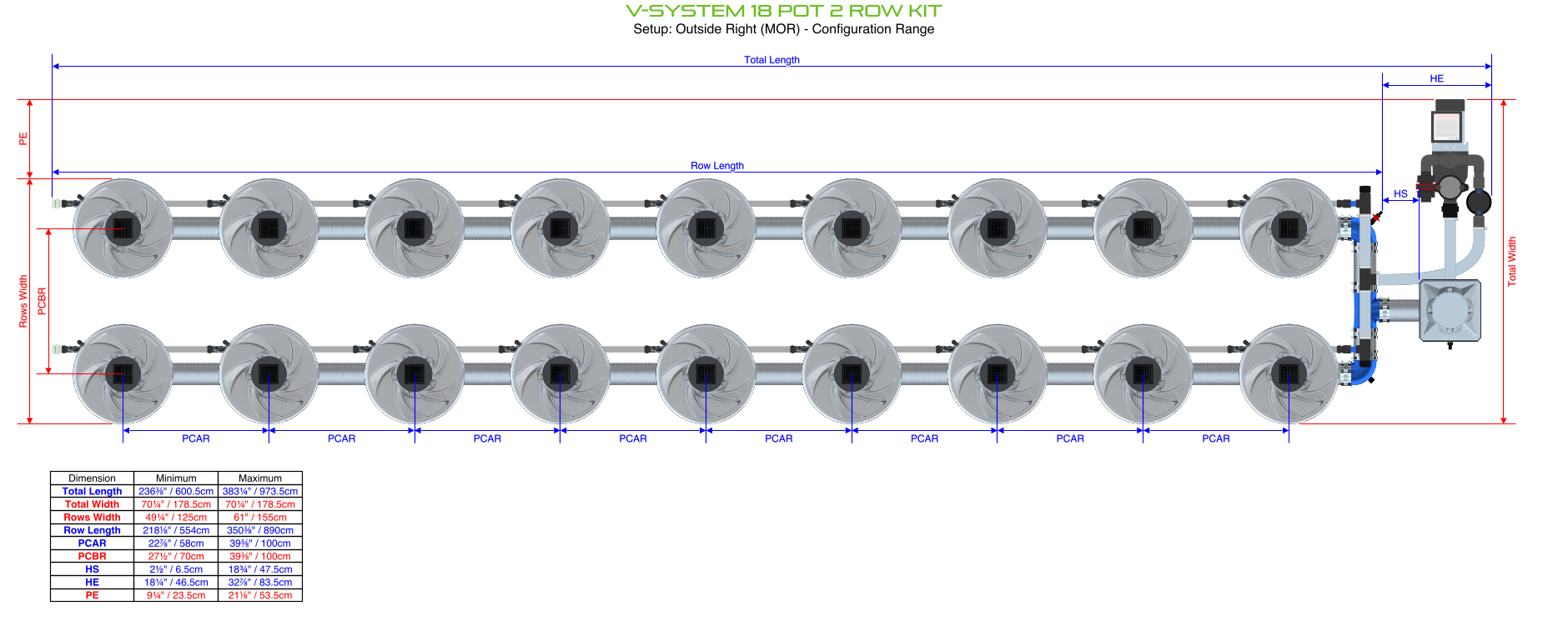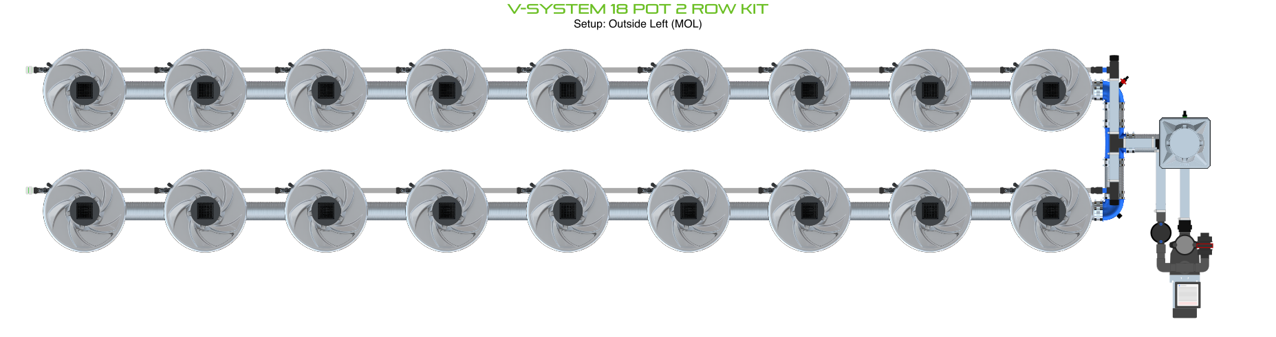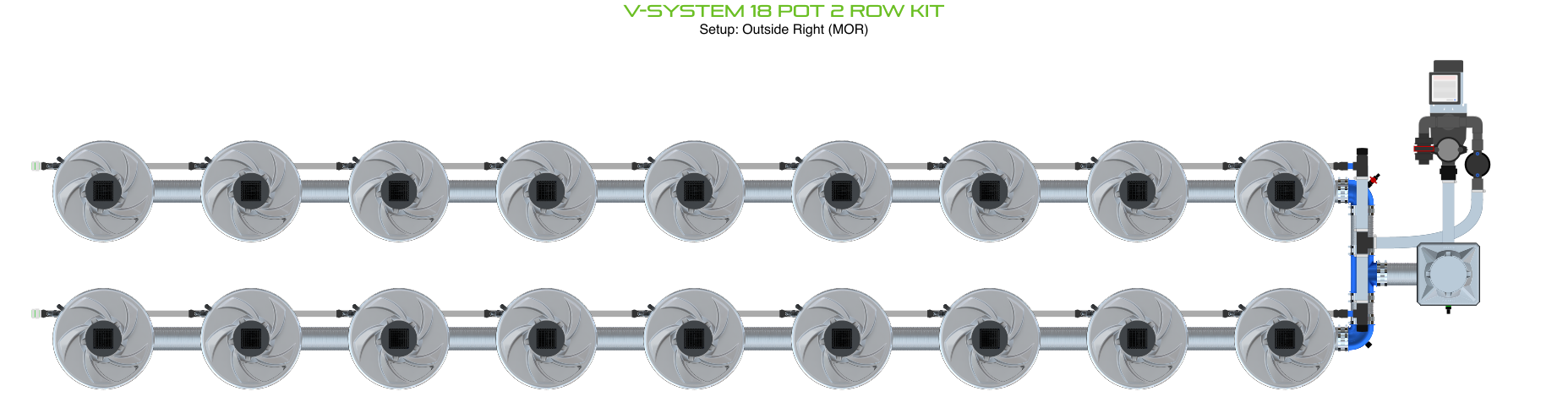 The ALIEN V-SYSTEM 18 Pot 2 Row Kit has 4 layout options for header and pump placement to best fit your grow area. The header and pump can be placed outside a grow tent / room, or made as compact as possible. Easy to configure and assemble with advanced features and setup options, grow 18 plants to perfection in the ultimate recirculating deep water culture with this ALIEN V-SYSTEM Kit!