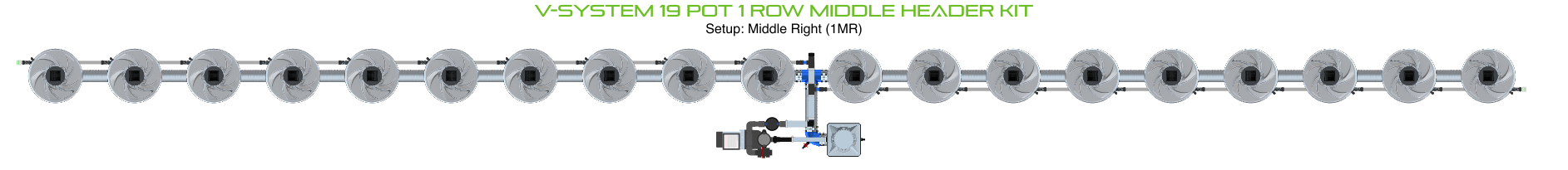 The ALIEN V-SYSTEM 19 Pot 1 Row Kit has 2 layout options for header and pump placement to best fit your grow area. The header and pump can be placed outside a grow tent / room, or made as compact as possible. Easy to configure and assemble with advanced features and setup options, grow 19 plants to perfection in the ultimate recirculating deep water culture with this ALIEN V-SYSTEM Kit!