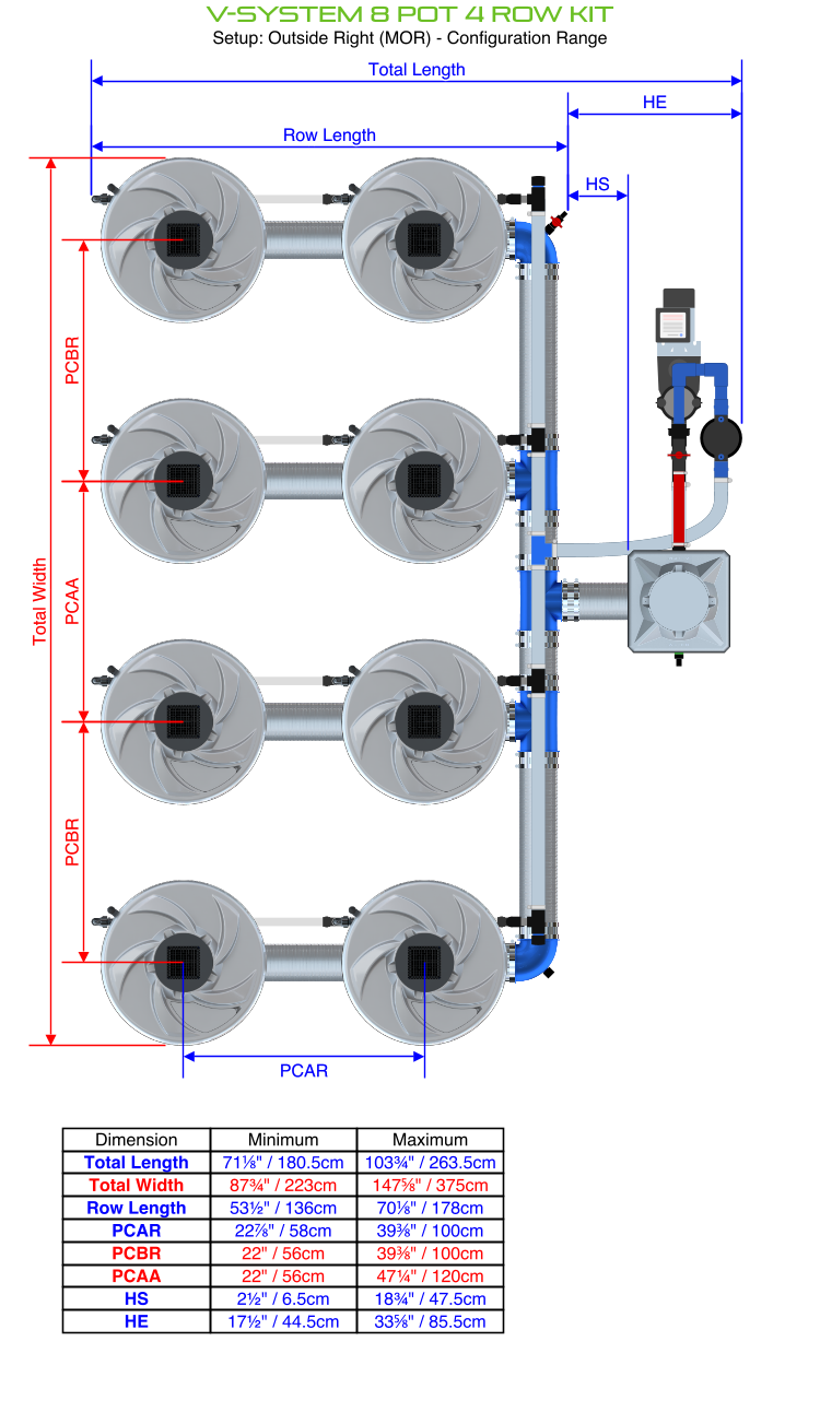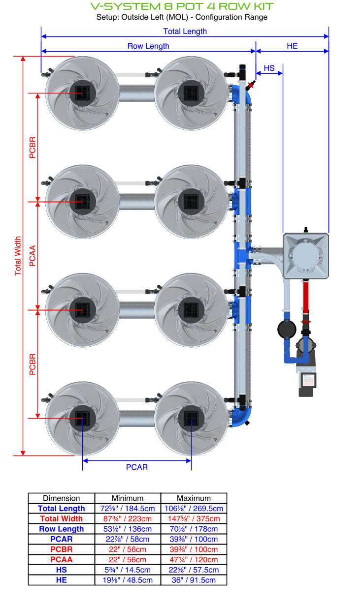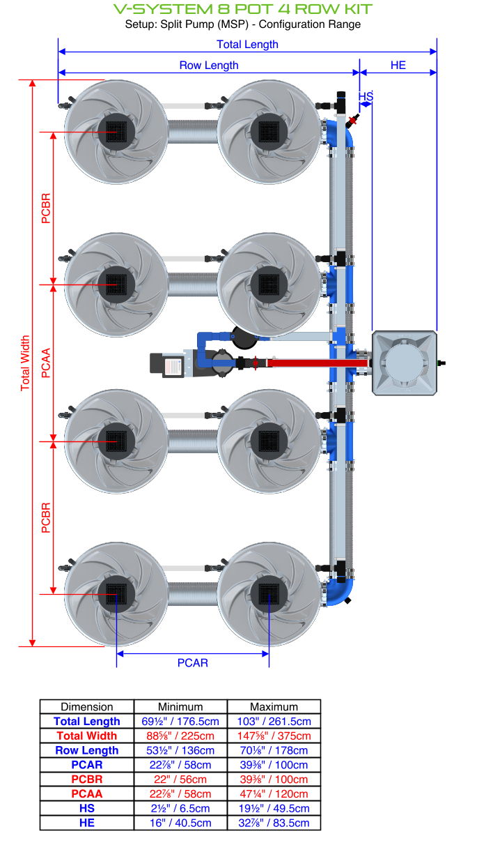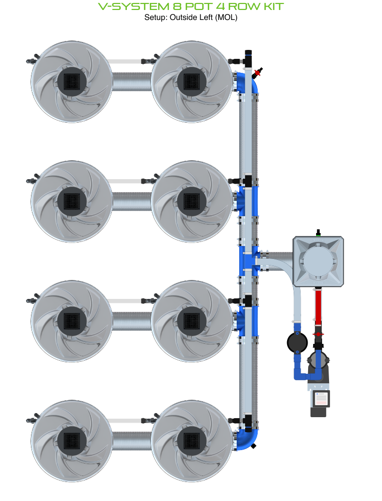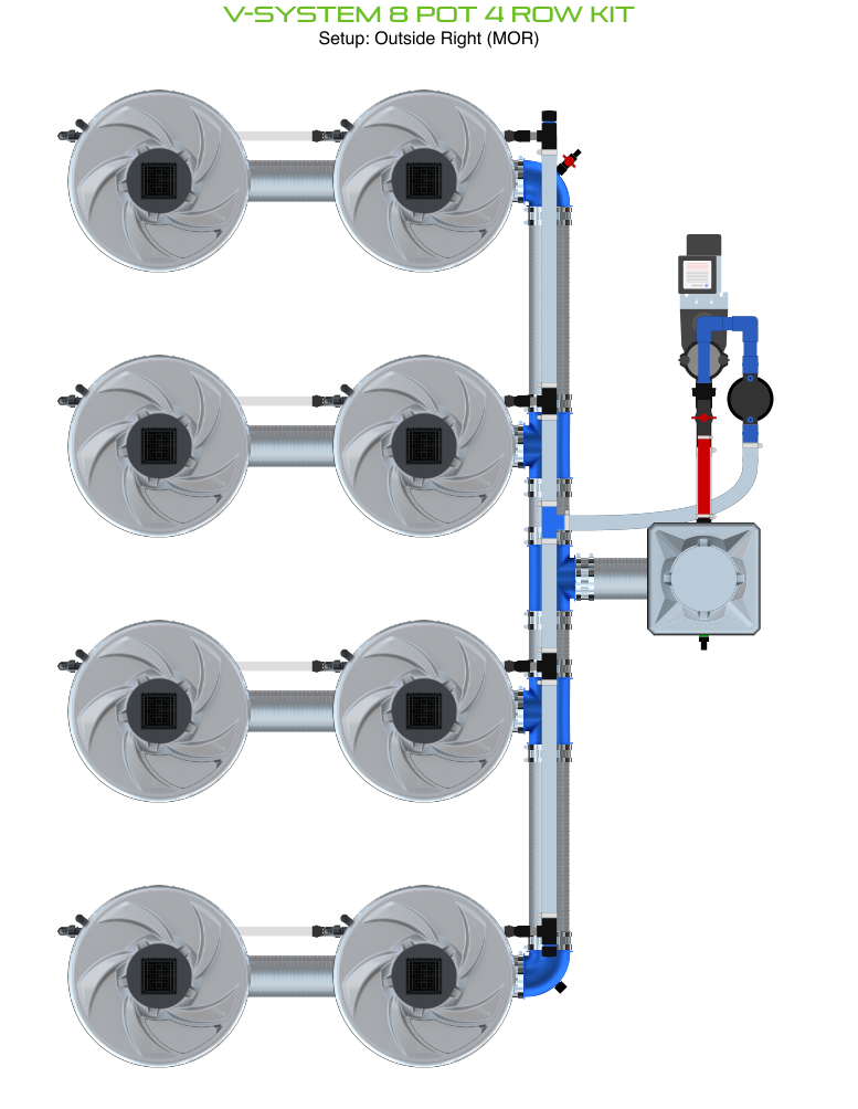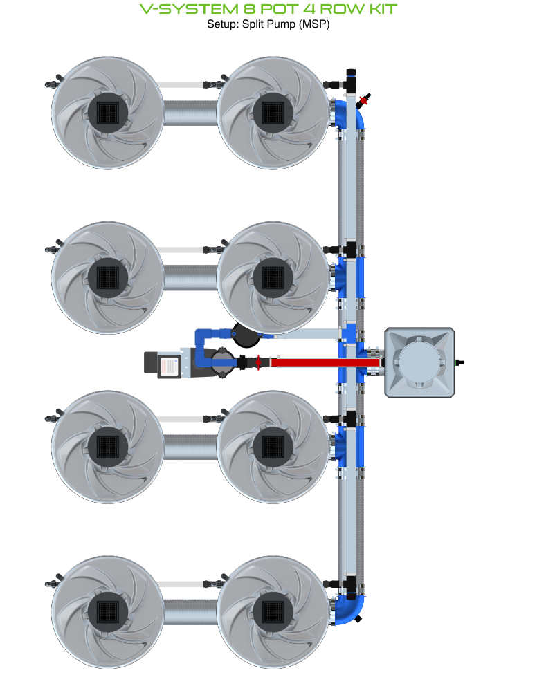 The ALIEN V-SYSTEM 8 Pot 4 Row Kit has 4 layout options for header and pump placement to best fit your grow area. The header and pump can be placed outside a grow tent / room, or made as compact as possible. Easy to configure and assemble with advanced features and setup options, grow 8 plants to perfection in the ultimate recirculating deep water culture with this ALIEN V-SYSTEM Kit!