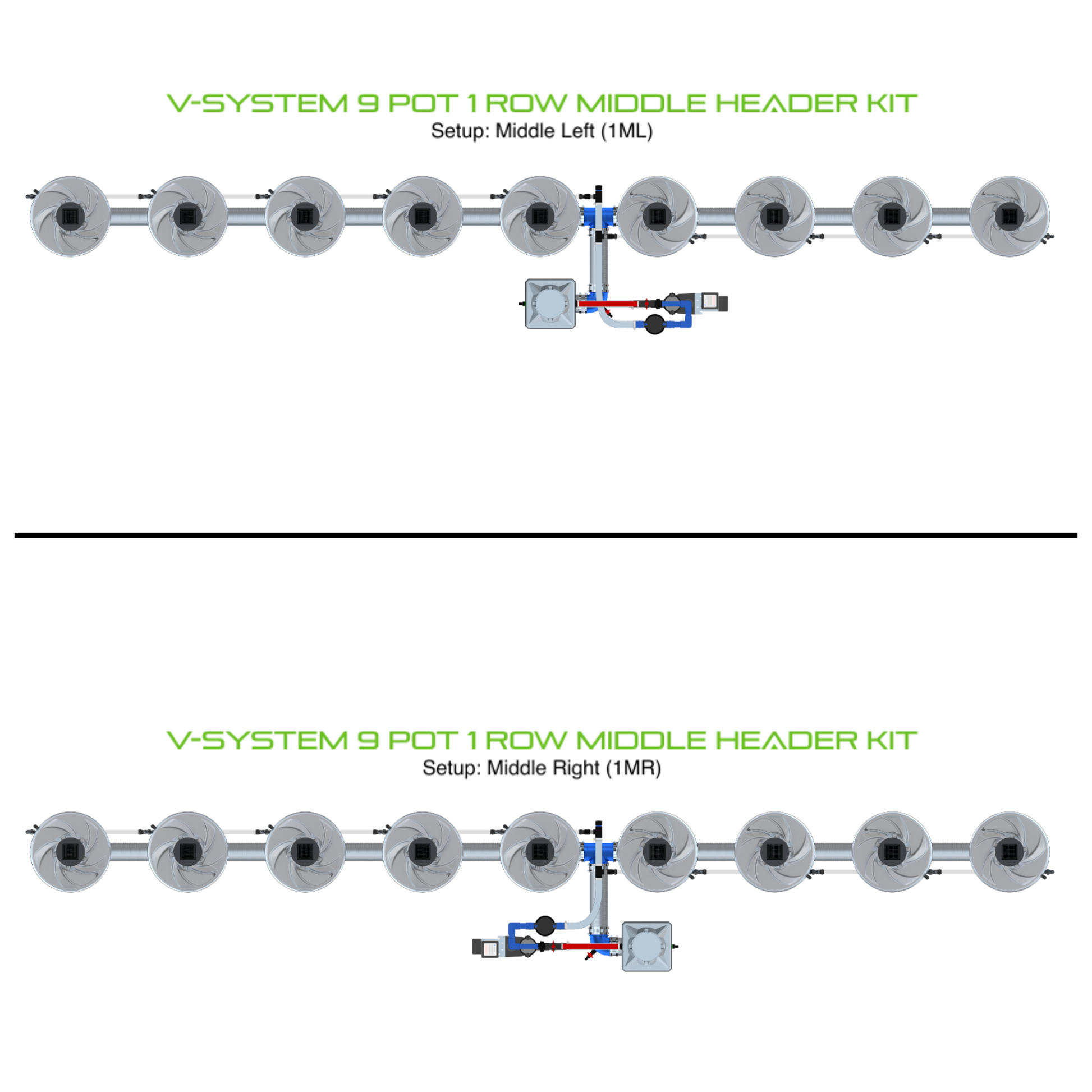 The ALIEN V-SYSTEM 9 Pot 1 Row Kit is available in two different versions, with the header either at the end of the row or in the middle. For end header kits, there are 3 layout options for header and pump placement relative to the row of pots, and 2 layout options for middle header kits. The header and pump can be placed outside a grow tent / room, or made as compact as possible. Easy to configure and assemble with advanced features and setup options, grow 9 plants to perfection in the ultimate recirculating deep water culture with this ALIEN V-SYSTEM Kit!